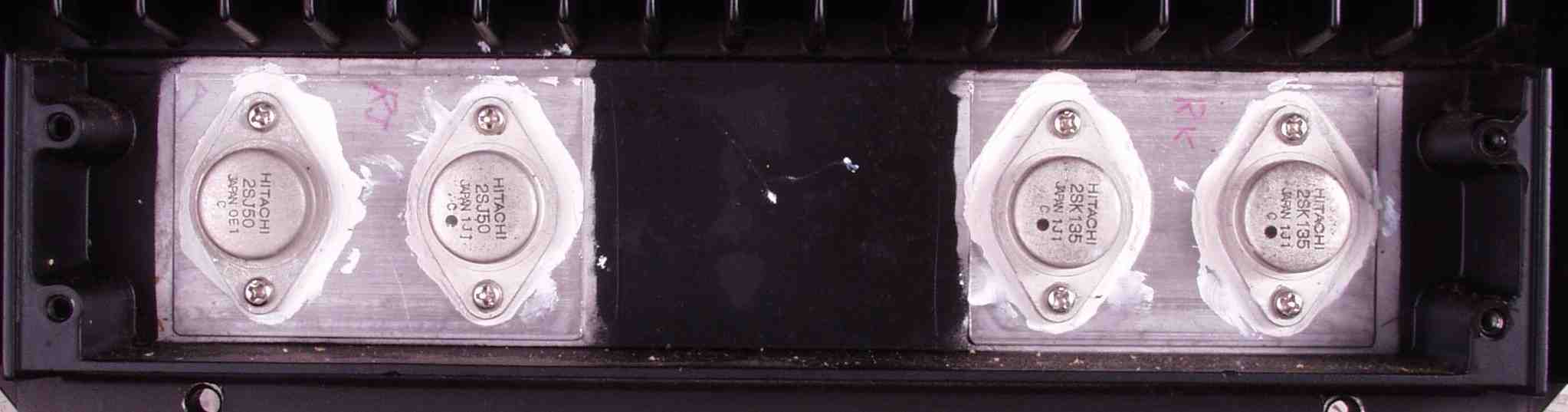 | C6A. 修理前 R終段FET(電界トランジスター) 左の2SJ50は他のドットとは異なる(交換されている) |