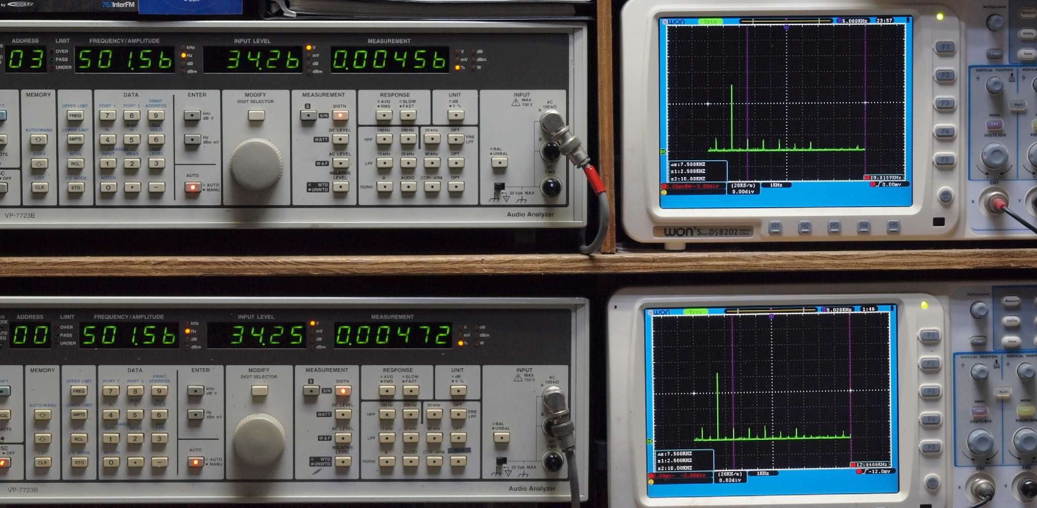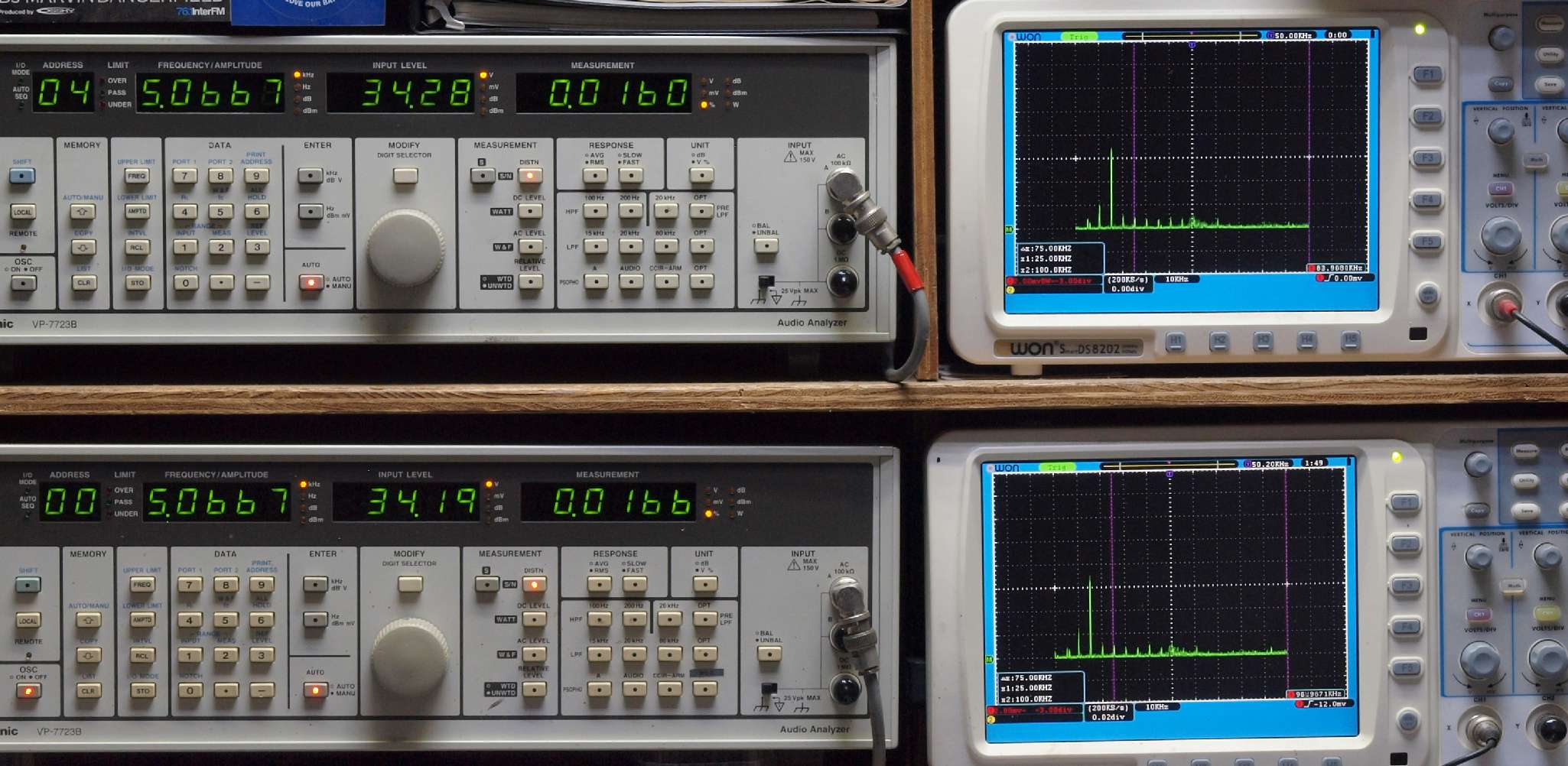 | E. 測定・調整。 画像をクリックすると、大きく(横幅2050ドット)表示されます。 E1. 出力・歪み率測定・調整 「見方」。 上段中 右側SP出力を「Audio Analyzer Panasonic VP−7723B」により測定。 表示LED、 左端=メモリーNo、 中左=周波数測定、 中右=出力電圧測定、 右端=歪み率測定。 上段右端 VP−7723Bの基本波除去出力を「owon SDS8202(200MHZ)」で「FFT分析」表示。 下段中 左側SP出力を「Audio Analyzer Panasonic VP−7723B」により測定。 表示LED、 左端=メモリーNo、 中左=周波数測定、 中右=出力電圧測定、 右端=歪み率測定。 下段右端 VP−7723Bの基本波除去出力を「owon SDS6062(200MHZ)」で「FFT分析」表示。 下段左端 オーディオ発振器 VP−7201A より50Hz〜100kHzの信号を出し(歪み率=約0.003%)、ATT+分配器を通し、AMPに入力。 よって、ダイアル設定出力レベルより低くなります。測定機器の仕様や整備の様子はこちら、「VP−7723B」「VP−7201A」。 FFT画面の見方はこちら。 |