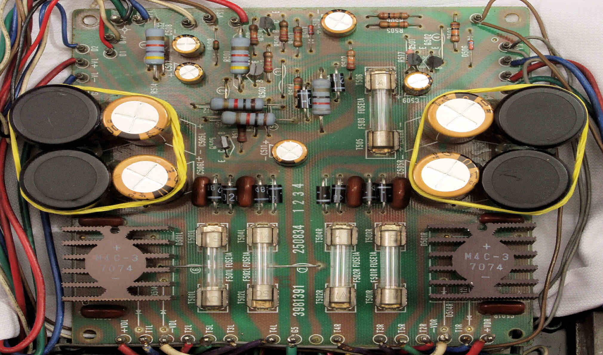 | C52. 修理後 電源基板 フューズ入り抵抗全部、電解コンデンサー9個、整流ダイオード10個、ヒューズ交換、 輪ゴムは接着材が固まるまで使用 |