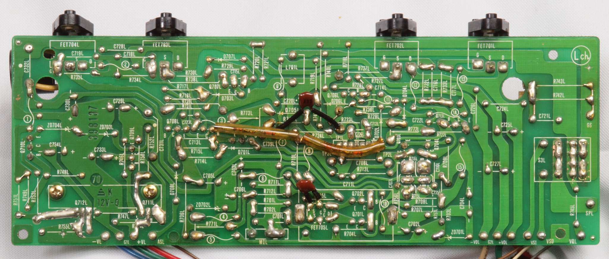 C11. 修理前 R側ドライブ基板。 入手難のヒューズ入り抵抗が全て普通の抵抗に交換されている。