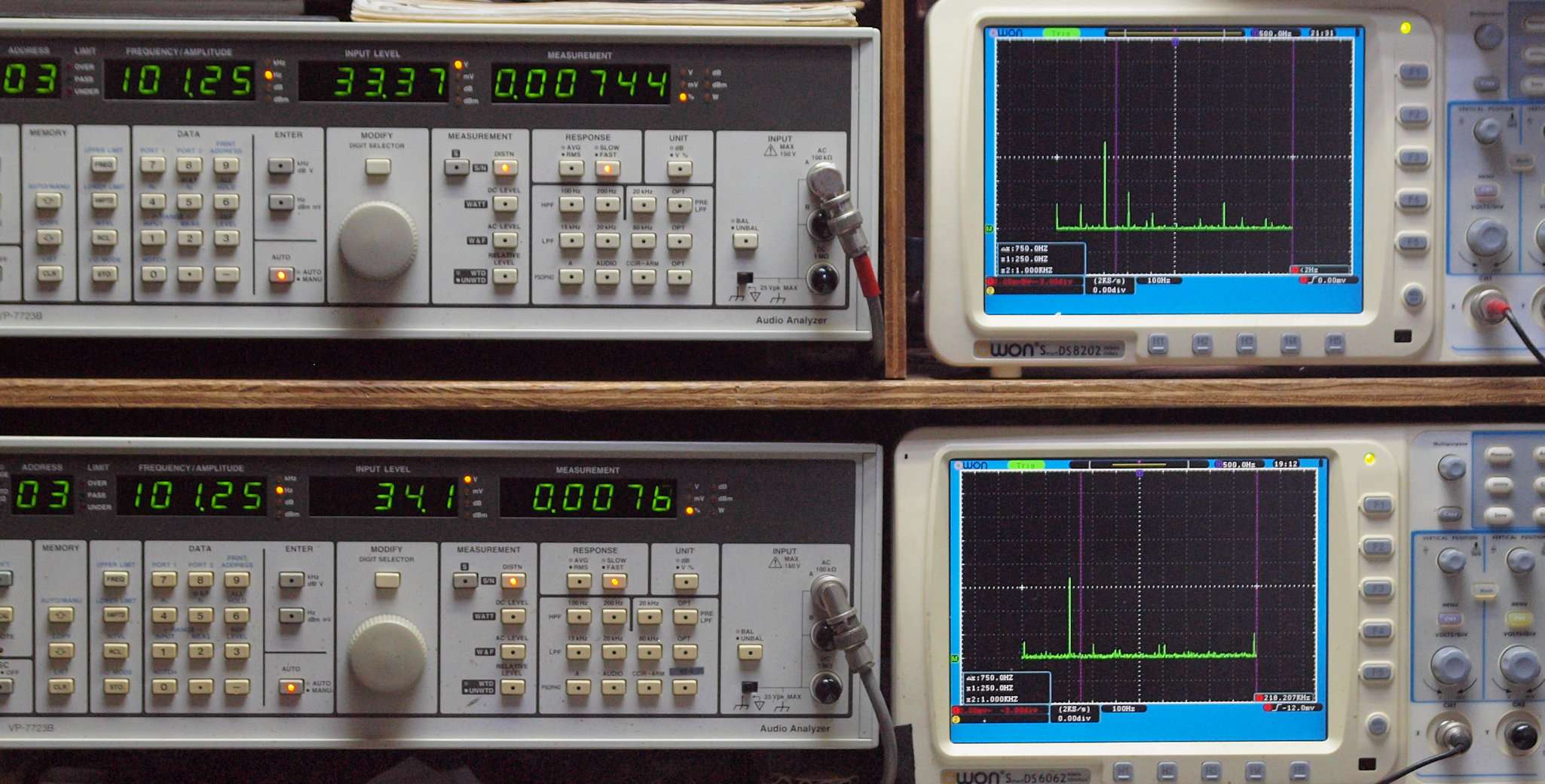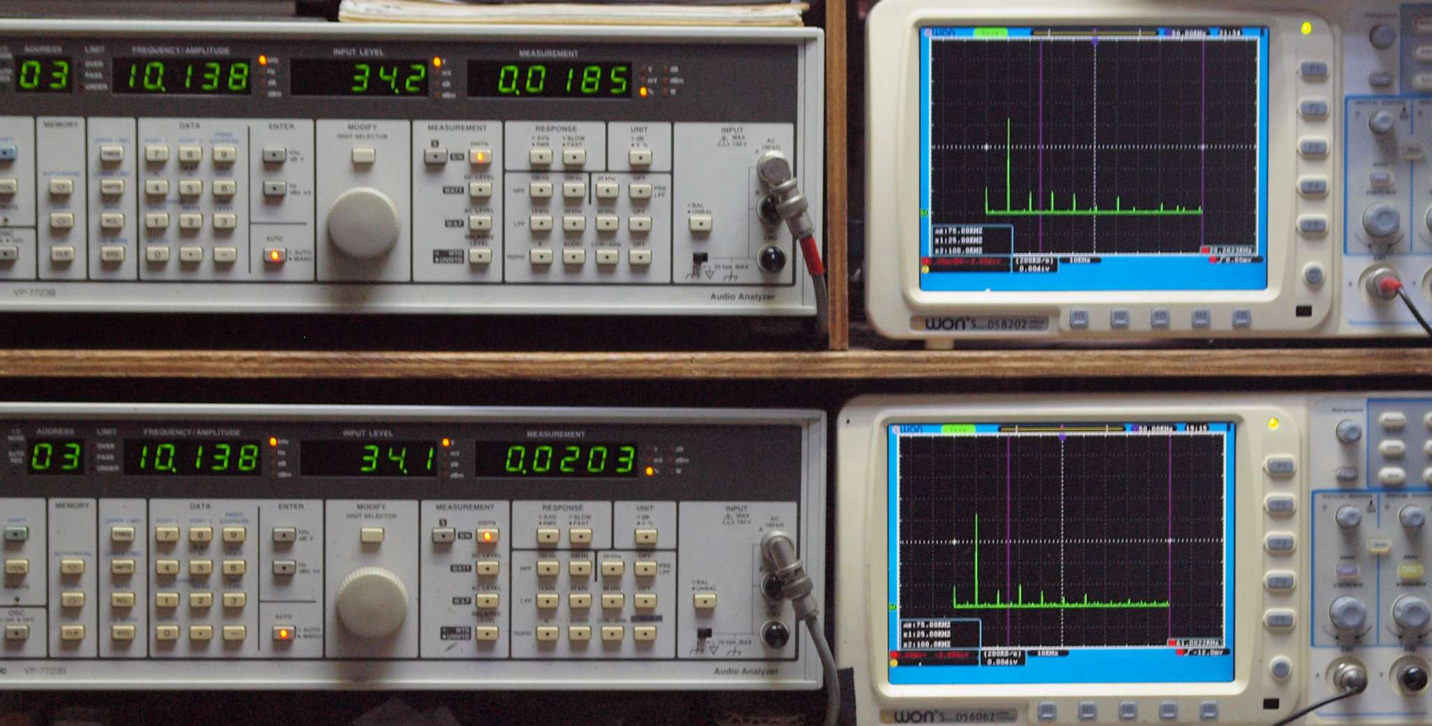 | E. 測定・調整。 画像をクリックすると、大きく(横幅2050ドット)表示されます。 E0. 出力・歪み率測定・調整 「見方」。 上段中 右側SP出力を「Audio Analyzer Panasonic VP−7723B」により測定。 表示LED、 左端=メモリーNo、 中左=周波数測定、 中右=出力電圧測定、 右端=歪み率測定。 上段右端 VP−7723Bの基本波除去出力を「owon SDS8202(200MHZ)」で「FFT分析」表示。 下段中 左側SP出力を「Audio Analyzer Panasonic VP−7723B」により測定。 表示LED、 左端=メモリーNo、 中左=周波数測定、 中右=出力電圧測定、 右端=歪み率測定。 下段右端 VP−7723Bの基本波除去出力を「owon SDS6062(200MHZ)」で「FFT分析」表示。 下段左端 オーディオ発振器 VP−7201A より50Hz〜100kHzの信号を出し(歪み率=約0.003%)、ATT+分配器を通し、AMPに入力。 よって、ダイアル設定出力レベルより低なります。測定機器の仕様や整備の様子はこちら、「VP−7723B」「VP−7201A」。 FFT画面の見方はこちら。 |