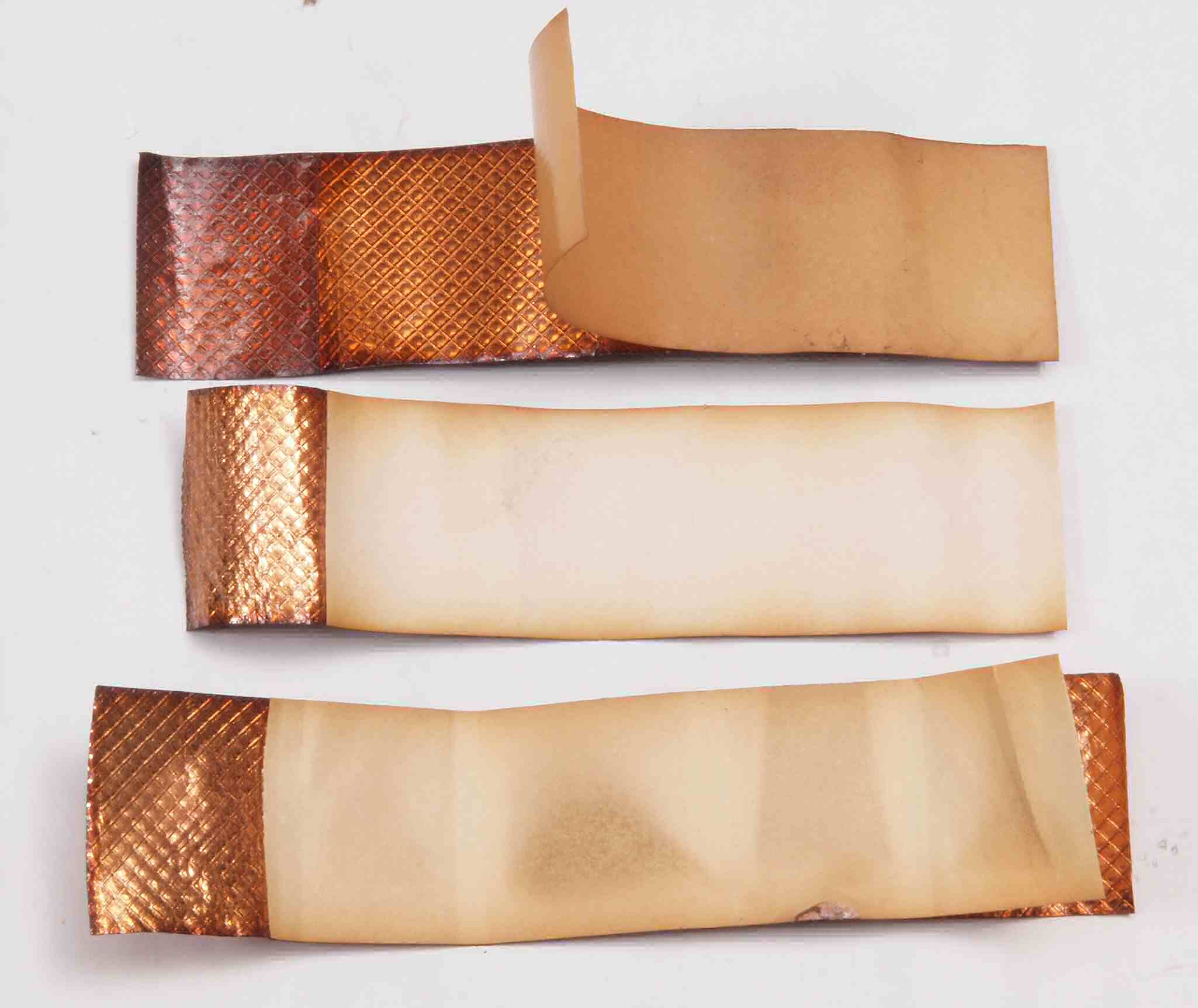 A313. 点検中 下蓋を取り、下から見る。銅箔テープは裏紙がそのままで、コンデンサーに接着していなかった。