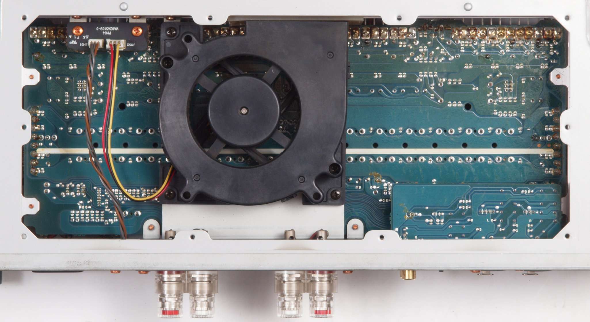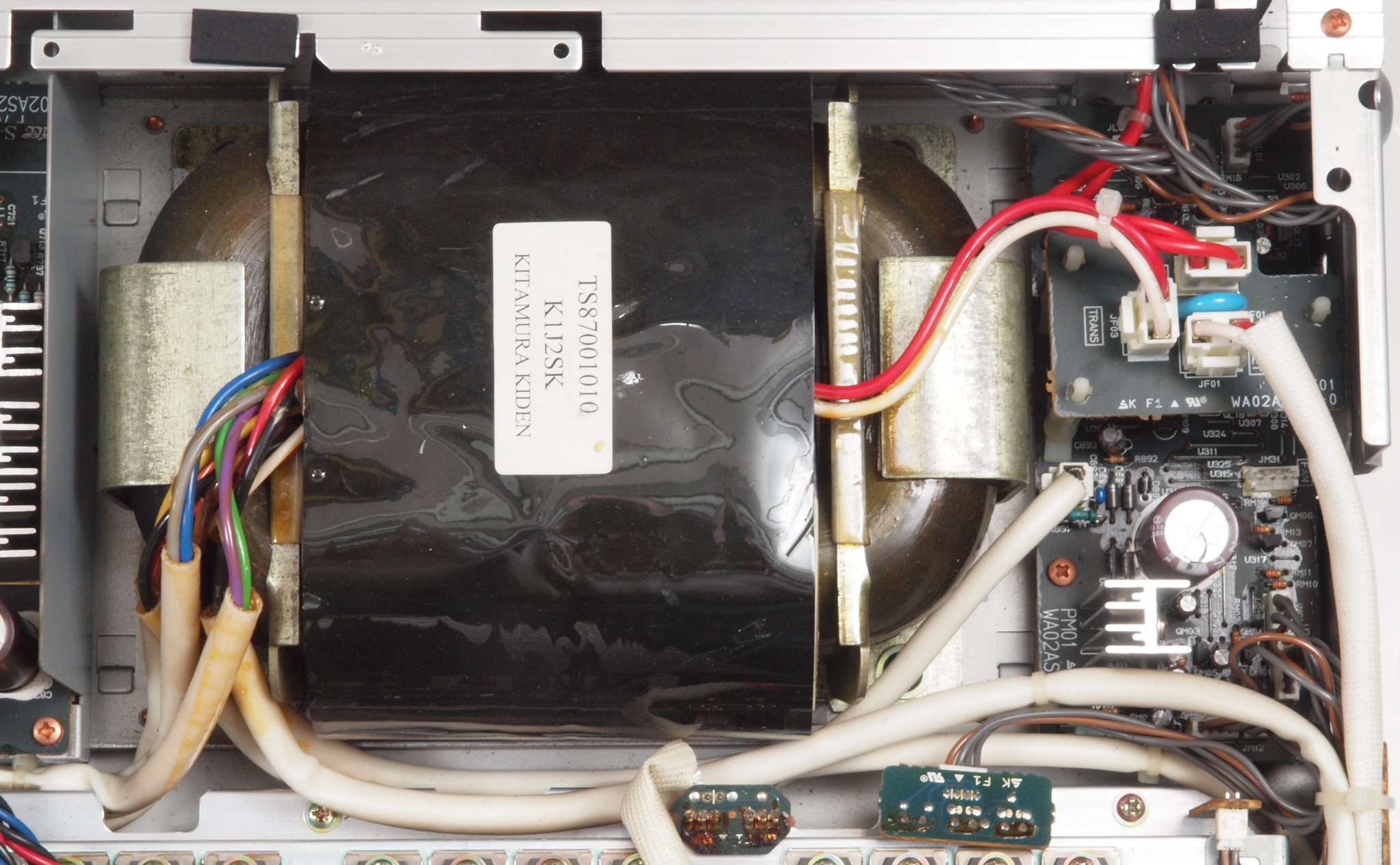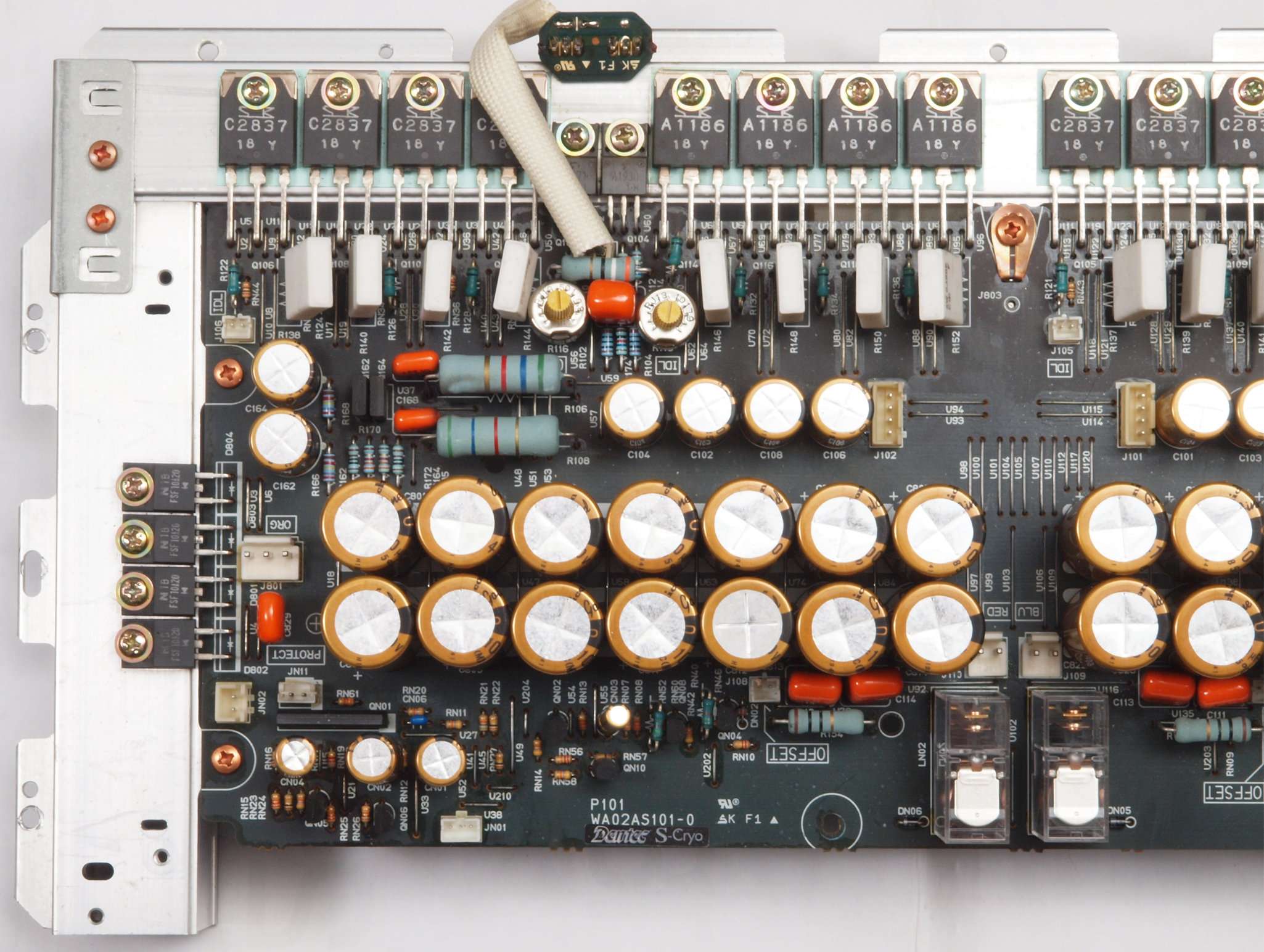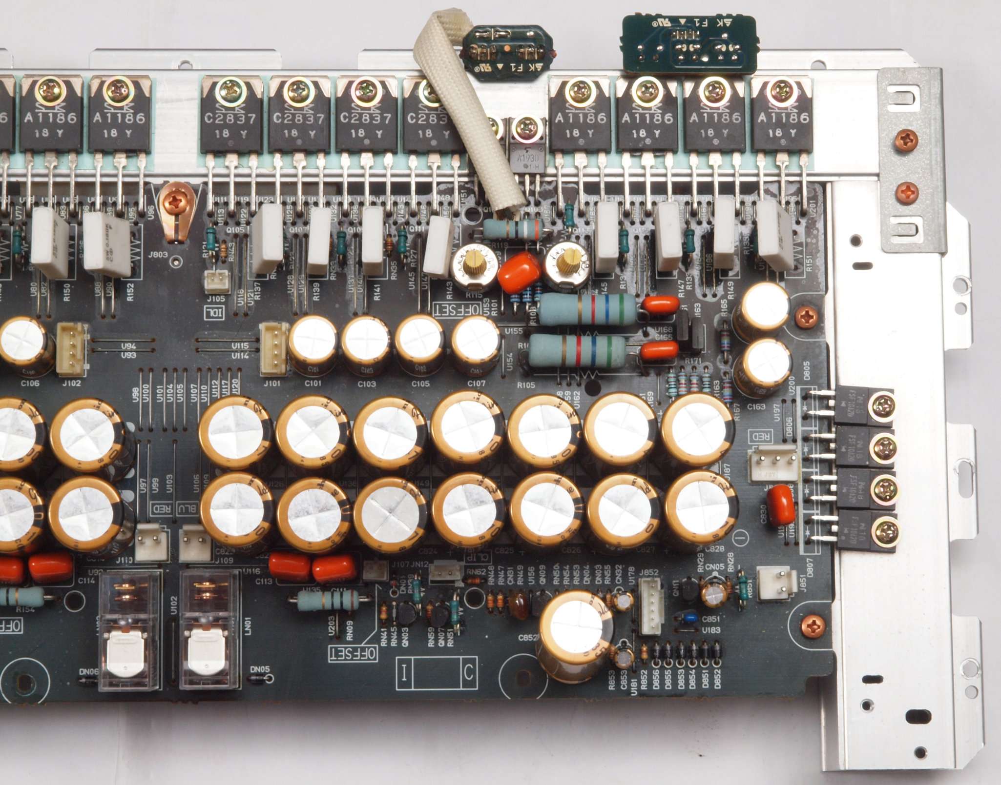 A44. 点検中 左側アンプブロック。 後発の同規格ニチコン製に交換可能。