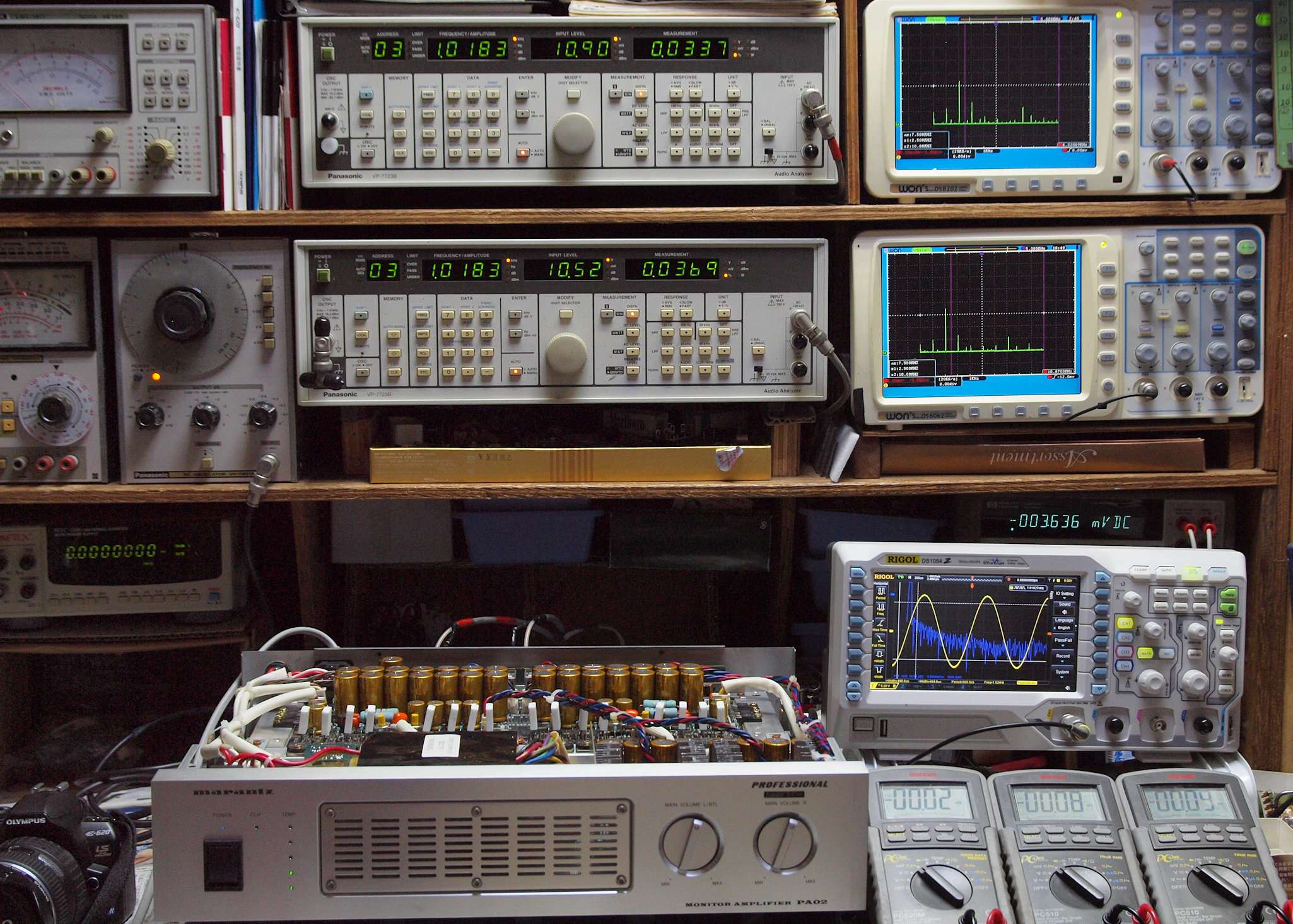 下段左端 オーディオ発振器 VP−7201A より50Hz〜100kHzの信号を出し(歪み率=約0.003%)、ATT+分配器を通し、AMPに入力。