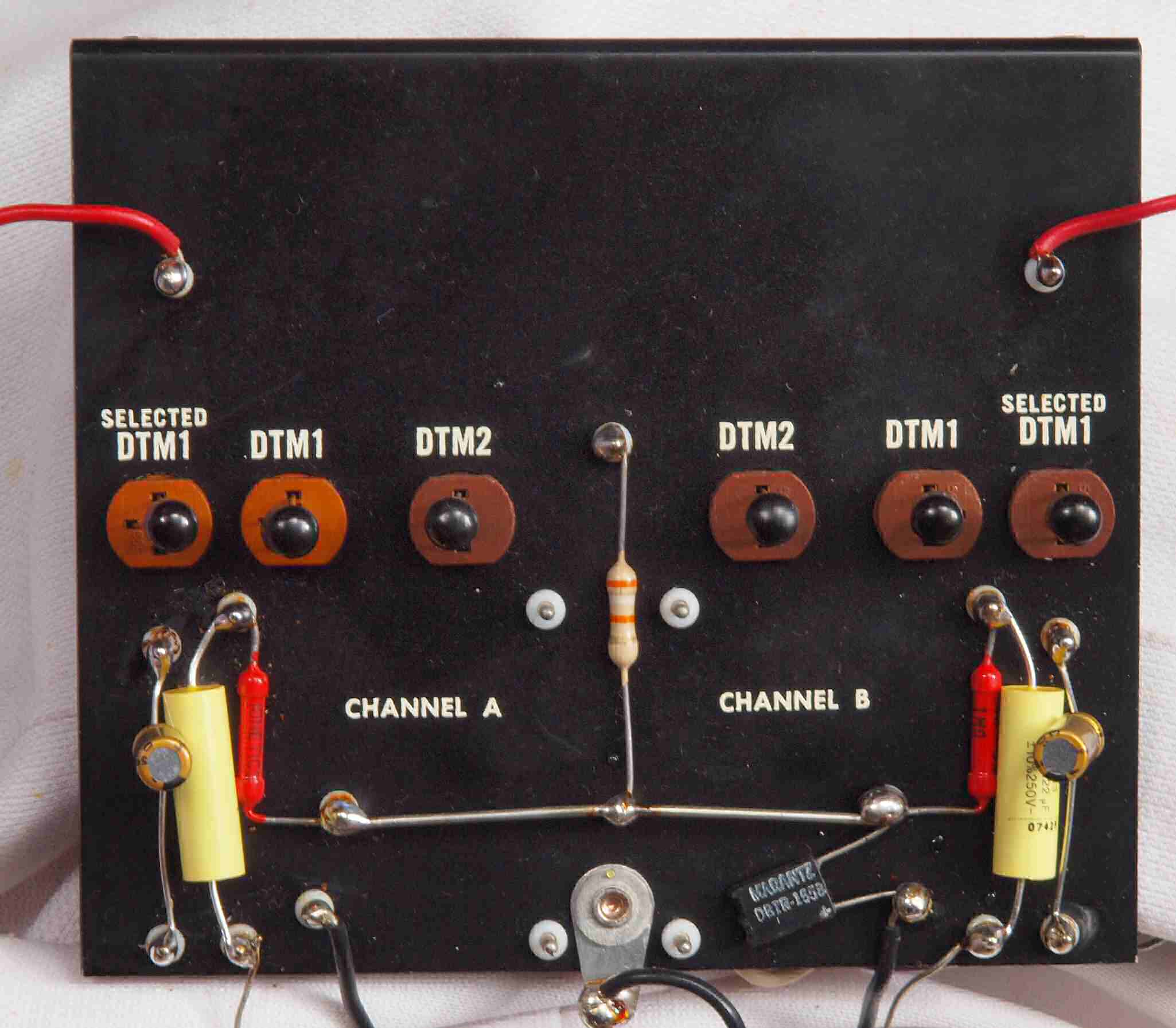 | A55. 点検中 入力RCA端子郡 テフロン絶縁仕様に交換可能。 ピッチが狭く、取り付けネジもギリギリ(参考写真)。 |
