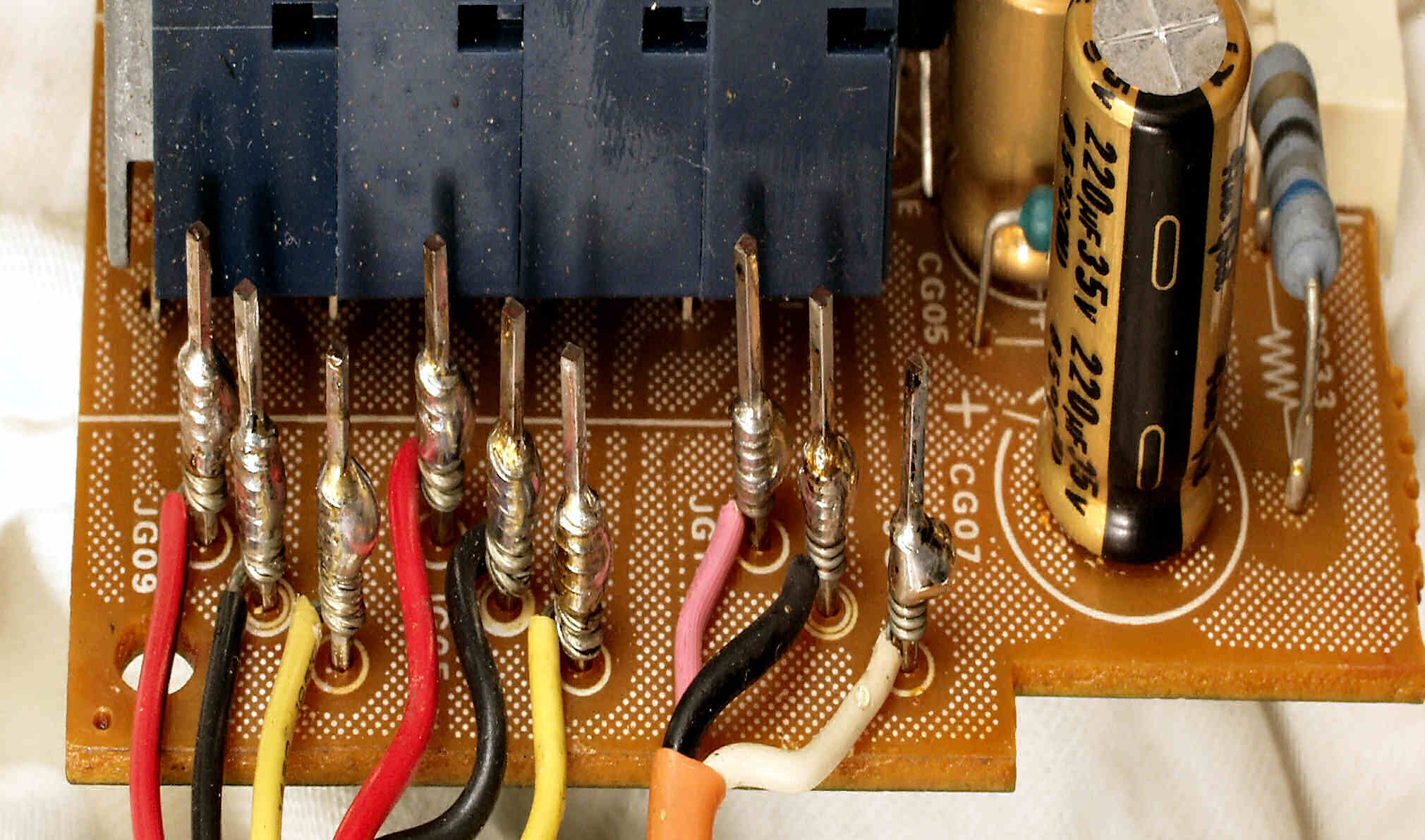 | CCE. 修理(半田補正)後 入出力RCA端子基板裏、 ラッピングも念の為、半田を流し込む。 | ||||||||||||||||||||