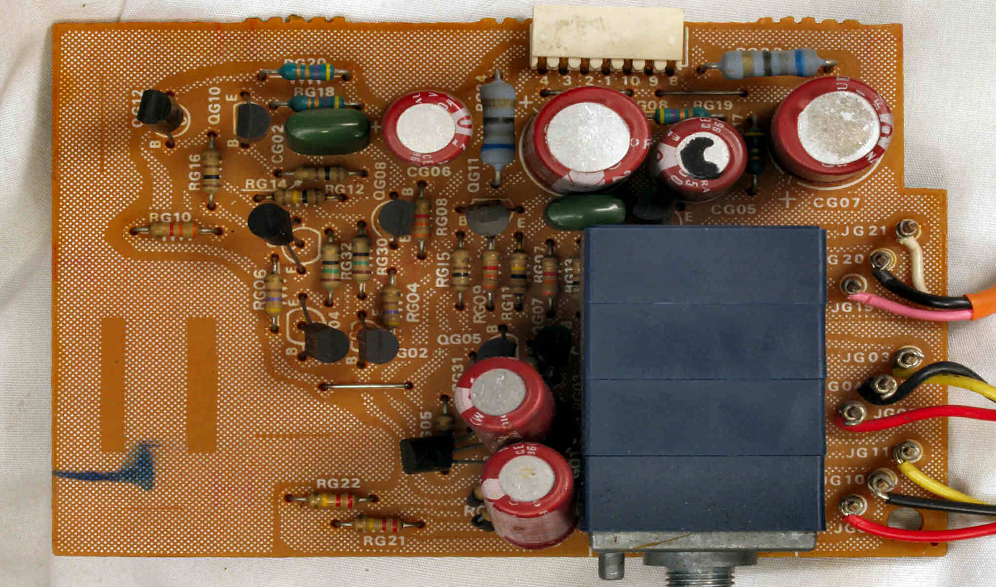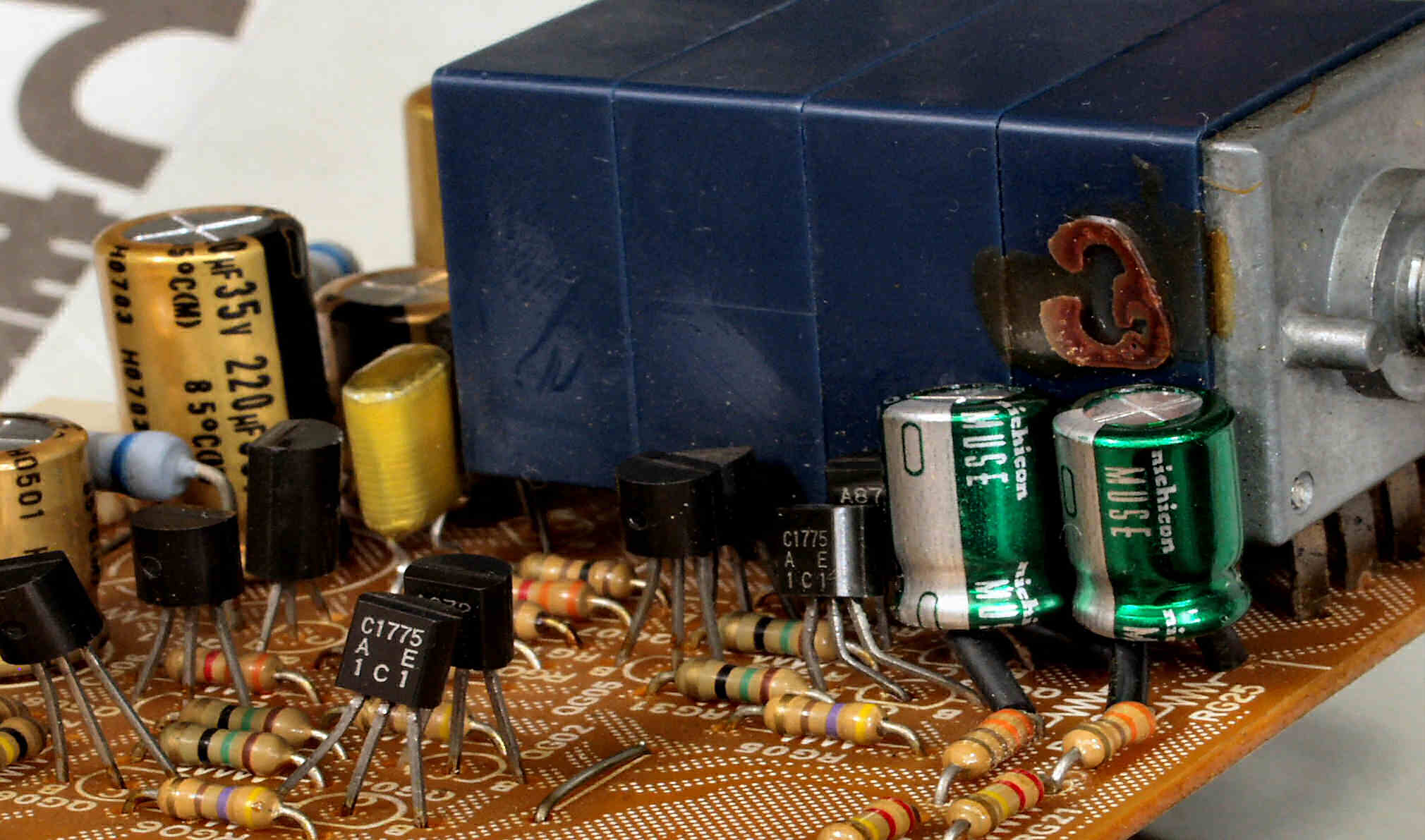 | C2A1. 修理後 HeadPhoneAMP基板 接着剤により腐食したTR(トランジスター)の足、真ん中の1本は断線。 | ||||||||||||||||||||