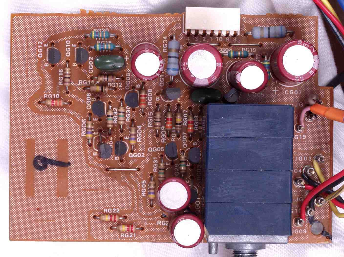 | C−7A. 修理前 MC−AMP基板 シールドケース内なので電解コンデンサーの頭のビニールの剥けが大きい | ||||||||||||||||||||