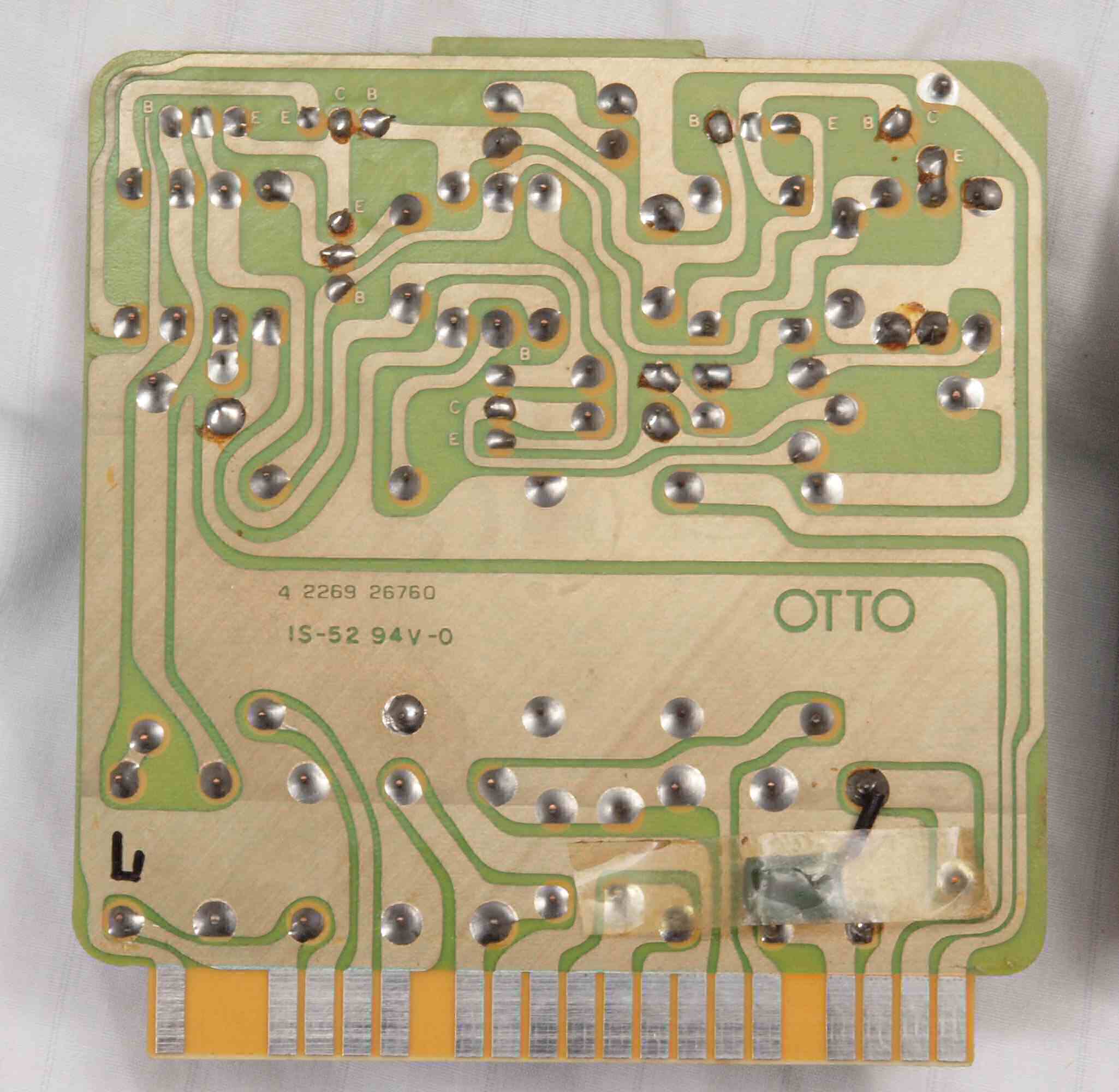 C13. 修理前 R側EQアンプ基板裏。 金メッキカードエッジコネクターなのに基板はハンダメッキ?