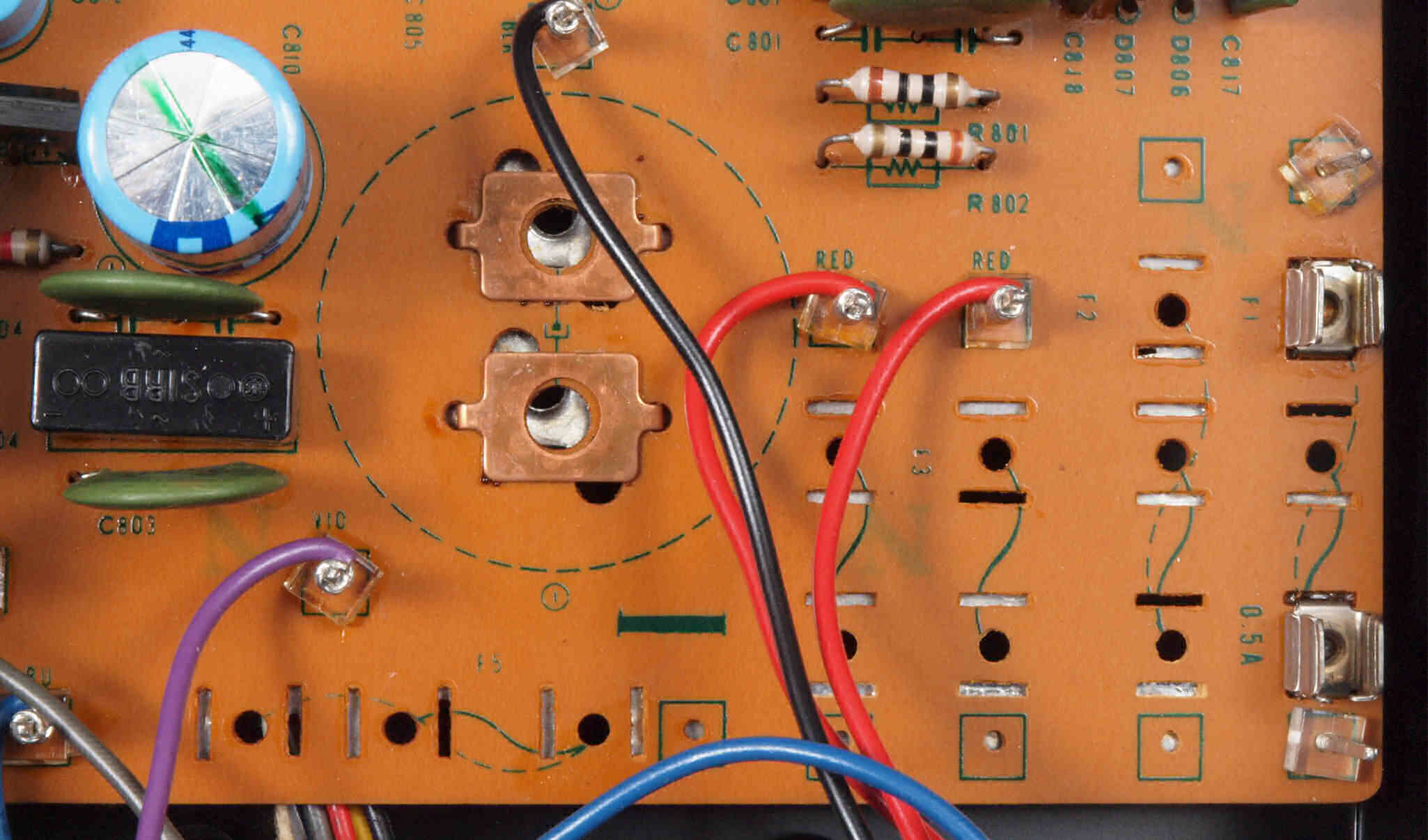 A53. 点検中 入出力RCA端子郡裏。 固定ナイロンピンが溶接固定されている。