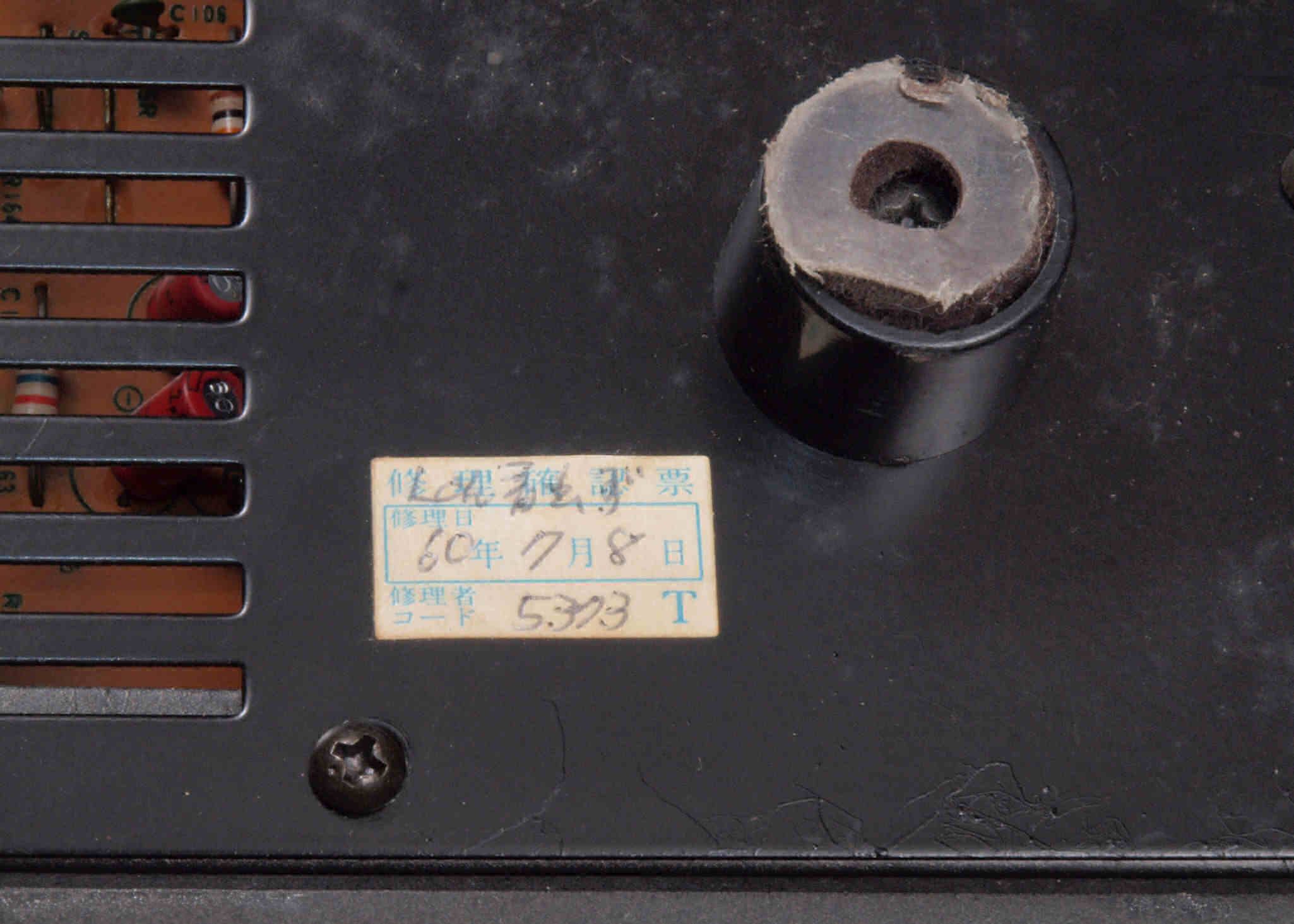 A26. 点検中 下から見る。 L側音出ずの修理票、1985/7/8.