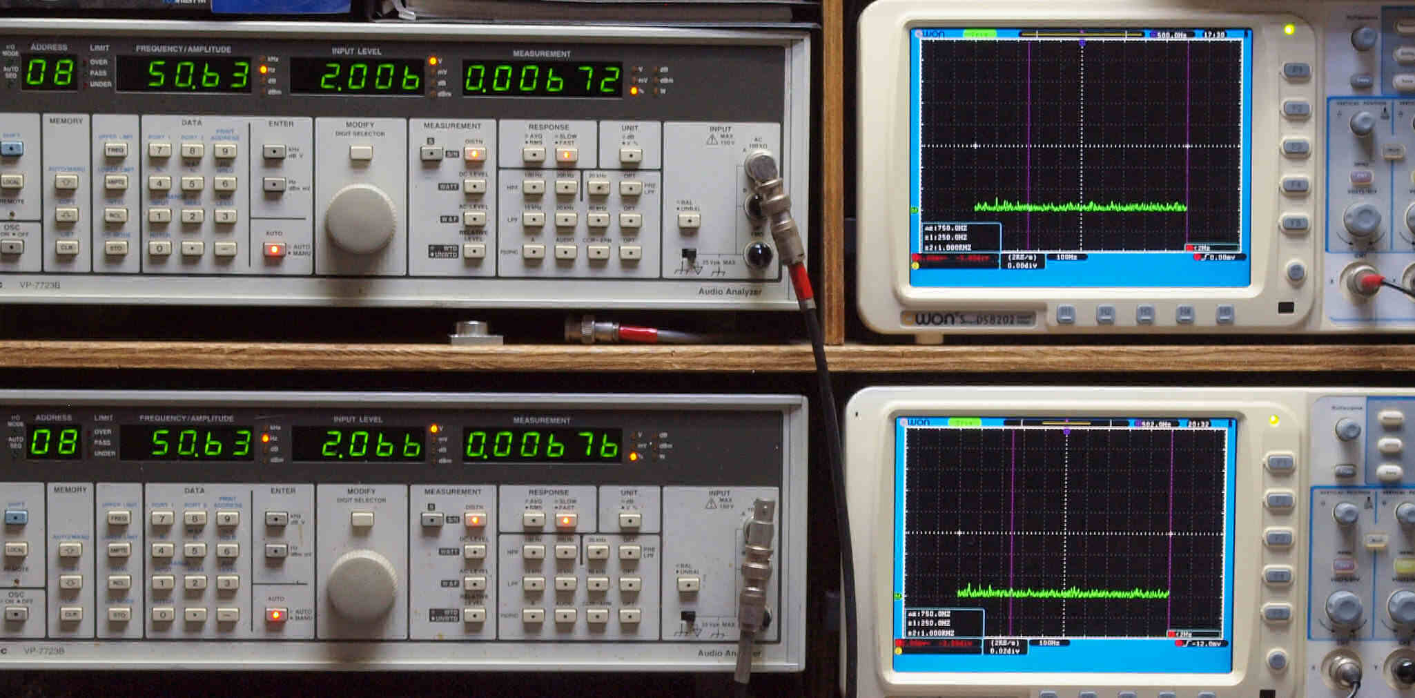 | E. 調整・測定。 画像をクリックすると、大きく(横幅2050ドット)表示されます。 E0. 出力・歪み率測定・調整。 「見方」。 上段中 右側SP出力を「Audio Analyzer Panasonic VP−7723B」により測定。 表示LED、 左端=メモリーNo、 中左=周波数測定、 中右=出力電圧測定、 右端=歪み率測定。 上段右端 VP−7723Bの基本波除去出力を「owon SDS8202(200MHZ)」で「FFT分析」表示。 下段中 左側SP出力を「Audio Analyzer Panasonic VP−7723B」により測定。 表示LED、 左端=メモリーNo、 中左=周波数測定、 中右=出力電圧測定、 右端=歪み率測定。 下段右端 VP−7723Bの基本波除去出力を「owon SDS6062(200MHZ)」で「FFT分析」表示。 下段左端 オーディオ発振器 VP−7201A より50Hz〜100kHzの信号を出し(歪み率=約0.003%)、ATT+分配器を通し、AMPに入力。 よって、ダイアル設定出力レベルより低くなります。測定機器の仕様や整備の様子はこちら、「VP−7723B」「VP−7201A」。 FFT画面の見方はこちら。 |