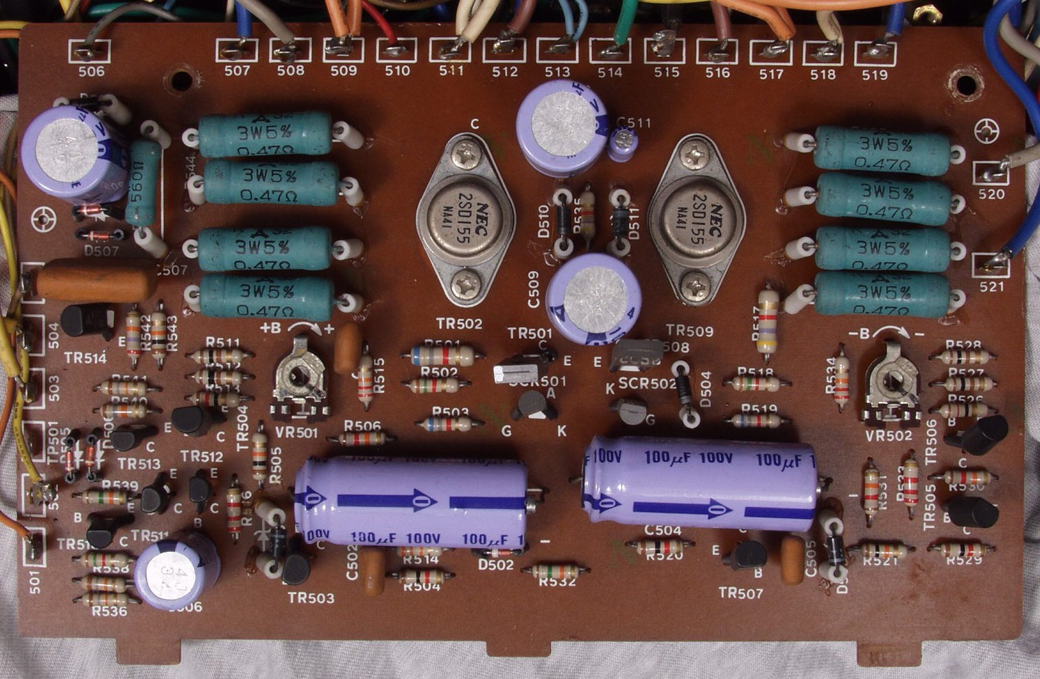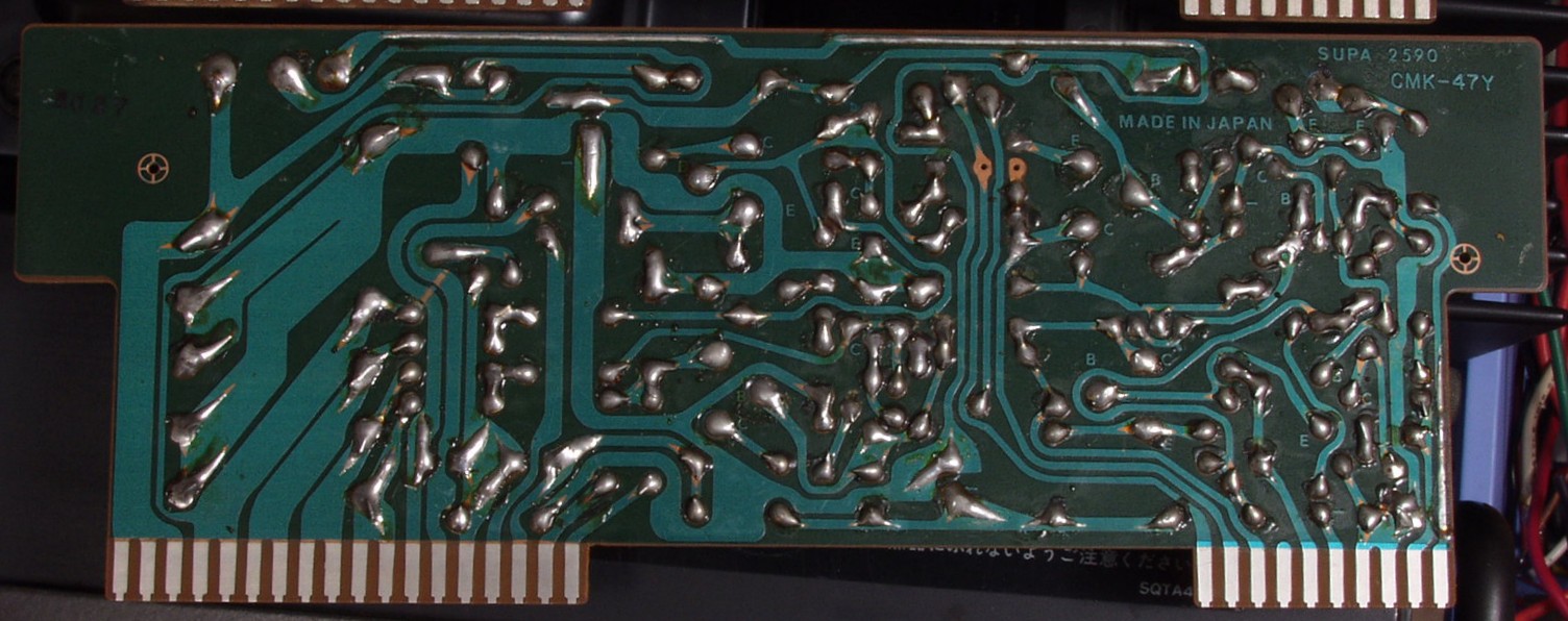| 寸評 終段TR(トランジスタ−)の供給電圧まで安定化した理想的なAMPです。 途中で基盤改造がありますので、未対策器は修理した方が良いです(対作品は「2a」のシールが添付) 高域の発振対策を施し、安全の為、フューズを挿入した |