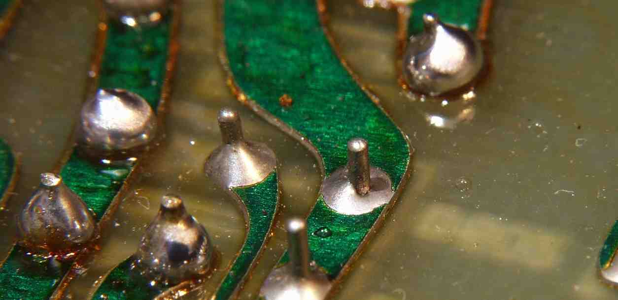 | C2C1. 修理中 電源部裏 のハンダ不良カ所 自動ハンダ装置ではこの様な事が起こります。 特に銅箔が厚いこの機種では注意が必要 てんこ盛りの所は、ハンダ補正が終了した物。 銅箔が厚いのでコテは通常の2倍の容量の物を使用する |