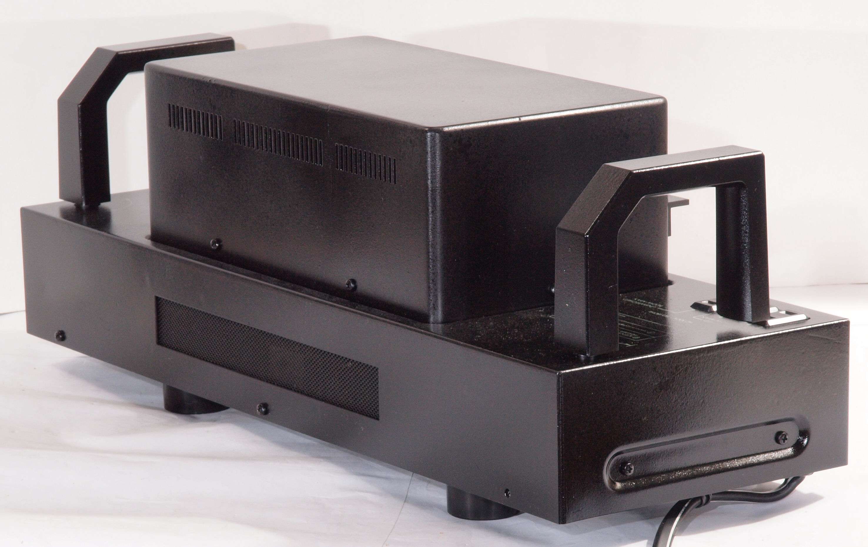| T. 前後パネル、上下・左右パネル、ビスの塗装。 画像をクリックすると、大きく(横幅2050ドット)表示されます。 T1. 塗装中 電源部上パネル。文字部分をマスキングして塗装後、クリヤースプレーを粒子状に吹き付け、半艶消しにする。 |