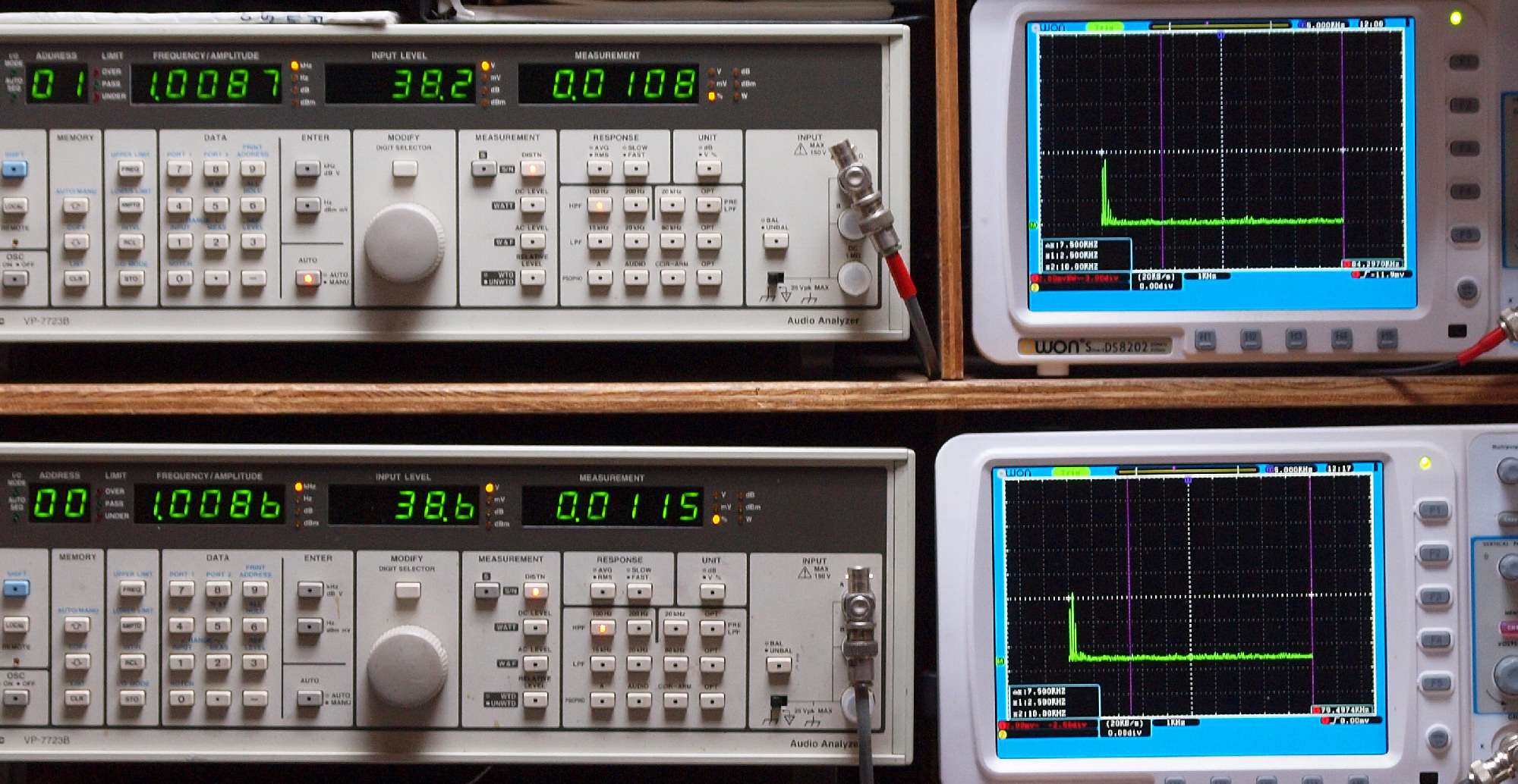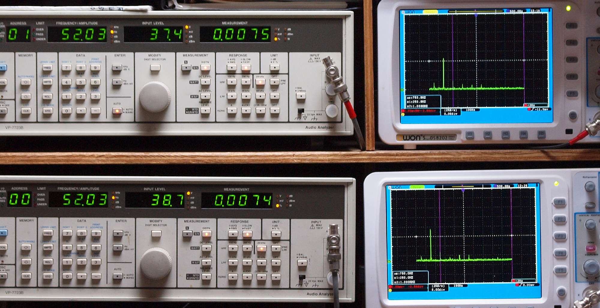 | E. 測定・調整。 画像をクリックすると、大きく(横幅2050ドット)表示されます。 E1. 出力・歪み率測定・調整 「見方」。 上段中 右側SP出力を「Audio Analyzer Panasonic VP−7723B」により測定。 表示LED、 左端=メモリーNo、 中左=周波数測定、 中右=出力電圧測定、 右端=歪み率測定。 上段右端 VP−7723Bの基本波除去出力を「owon SDS8202(200MHZ)」で「FFT分析」表示。 下段中 左側SP出力を「Audio Analyzer Panasonic VP−7723B」により測定。 表示LED、 左端=メモリーNo、 中左=周波数測定、 中右=出力電圧測定、 右端=歪み率測定。 下段右端 VP−7723Bの基本波除去出力を「owon SDS6062(200MHZ)」で「FFT分析」表示。 下段左端 オーディオ発振器 VP−7201A より50Hz〜100kHzの信号を出し(歪み率=約0.003%)、ATT+分配器を通し、AMPに入力。 よって、ダイアル設定出力レベルより低くなります。測定機器の仕様や整備の様子はこちら、「VP−7723B」「VP−7201A」。 FFT画面の見方はこちら。 |