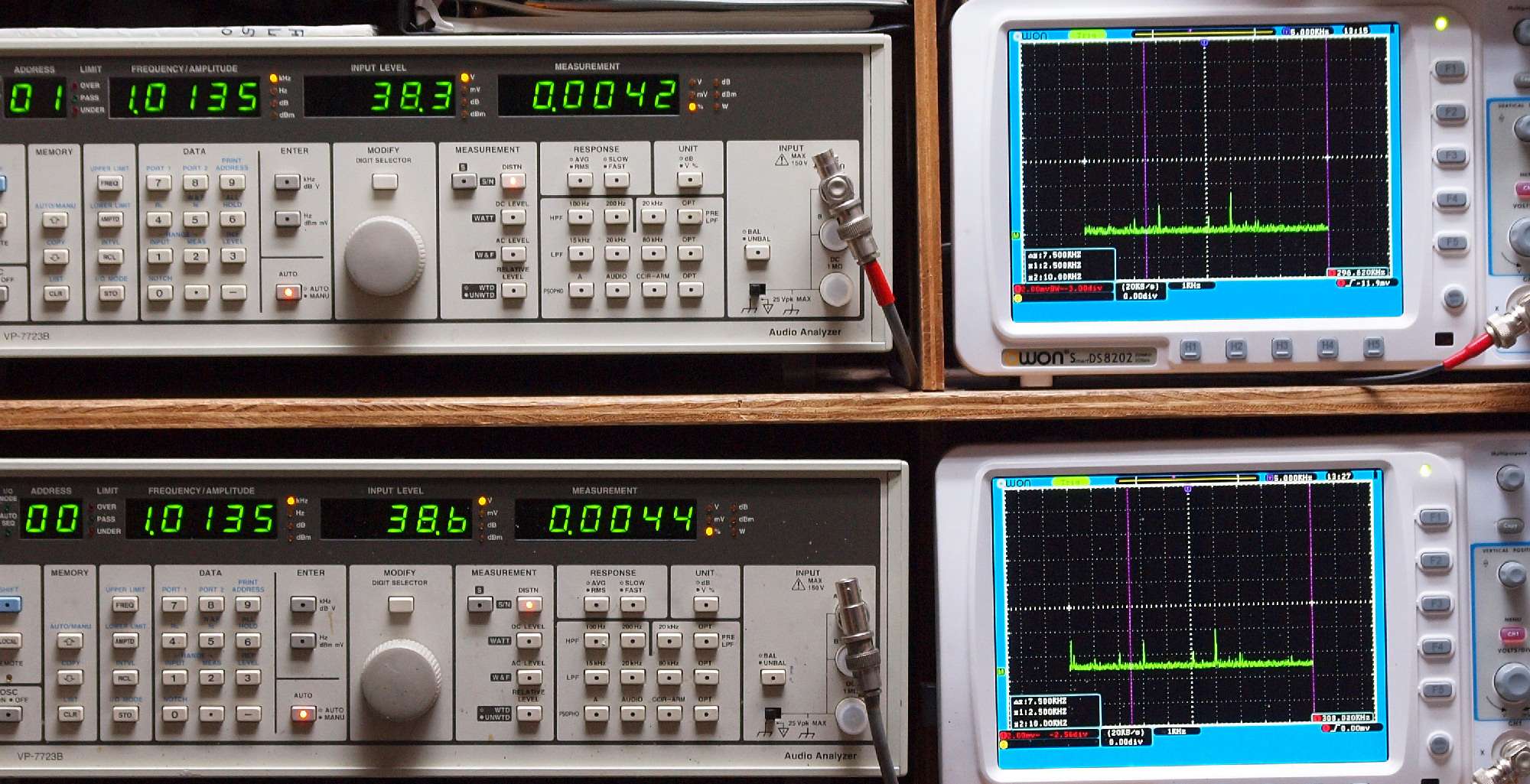 | E. 測定・調整 E1. 出力・歪み率測定・調整 「見方」。 上段中 右側SP出力を「Audio Analyzer Panasonic VP−7723B」により測定。 表示LED、 左端=メモリーNo、 中左=周波数測定、 中右=出力電圧測定、 右端=歪み率測定。 上段右端 VP−7723Bの基本波除去出力を「owon SDS8202(200MHZ)」で「FFT分析」表示。 下段中 左側SP出力を「Audio Analyzer Panasonic VP−7723B」により測定。 表示LED、 左端=メモリーNo、 中左=周波数測定、 中右=出力電圧測定、 右端=歪み率測定。 下段右端 VP−7723Bの基本波除去出力を「owon SDS6062(200MHZ)」で「FFT分析」表示。 下段左端 オーディオ発振器 VP−7201A より50Hz〜100kHzの信号を出し(歪み率=約0.003%)、ATT+分配器を通し、AMPに入力。 よって、ダイアル設定出力レベルより低くなります。測定機器の仕様や整備の様子はこちら、「VP−7723B」「VP−7201A」。 FFT画面の見方はこちら。 |