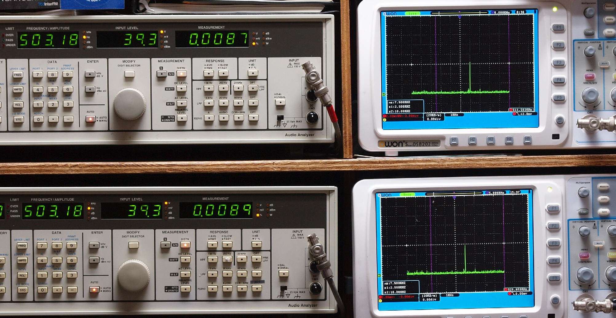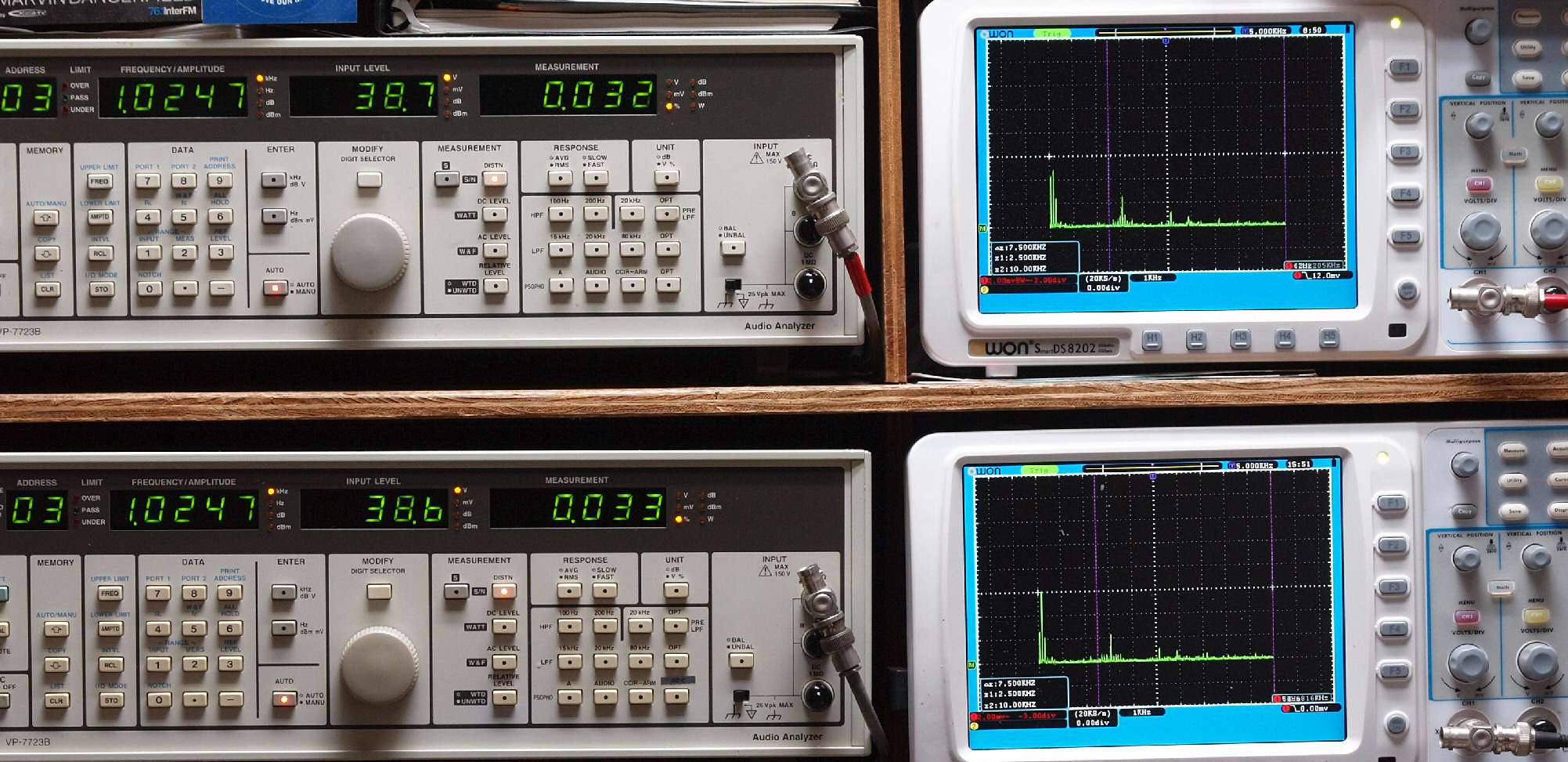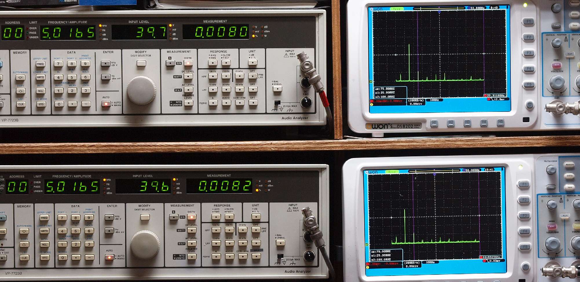 | E. 測定・調整 E1. 出力・歪み率測定・調整 「見方」。 上段中 右側SP出力を「Audio Analyzer Panasonic VP−7723B」により測定。 表示LED、 左端=メモリーNo、 中左=周波数測定、 中右=出力電圧測定、 右端=歪み率測定。 上段右端 VP−7723Bの基本波除去出力を「owon SDS8202(200MHZ)」で「FFT分析」表示。 下段中 左側SP出力を「Audio Analyzer Panasonic VP−7723B」により測定。 表示LED、 左端=メモリーNo、 中左=周波数測定、 中右=出力電圧測定、 右端=歪み率測定。 下段右端 VP−7723Bの基本波除去出力を「owon SDS6062(200MHZ)」で「FFT分析」表示。 下段左端 オーディオ発振器 VP−7201A より50Hz〜100kHzの信号を出し(歪み率=約0.003%)、ATT+分配器を通し、AMPに入力。 よって、ダイアル設定出力レベルより低くなります。測定機器の仕様や整備の様子はこちら、「VP−7723B」「VP−7201A」。 FFT画面の見方はこちら。 |