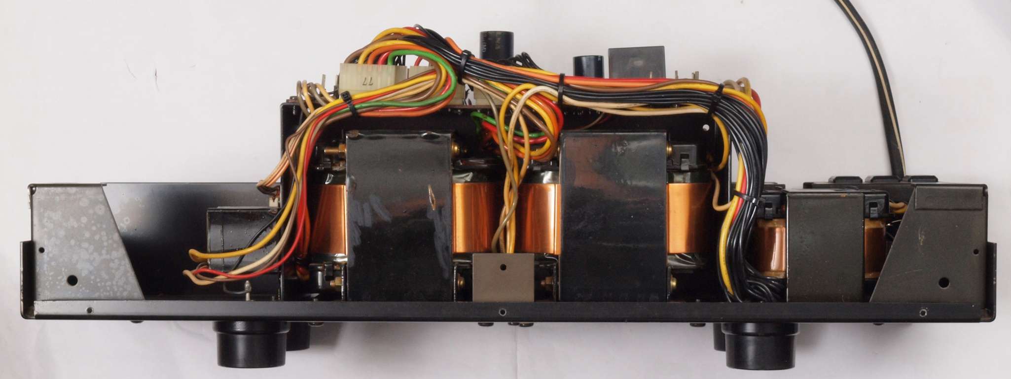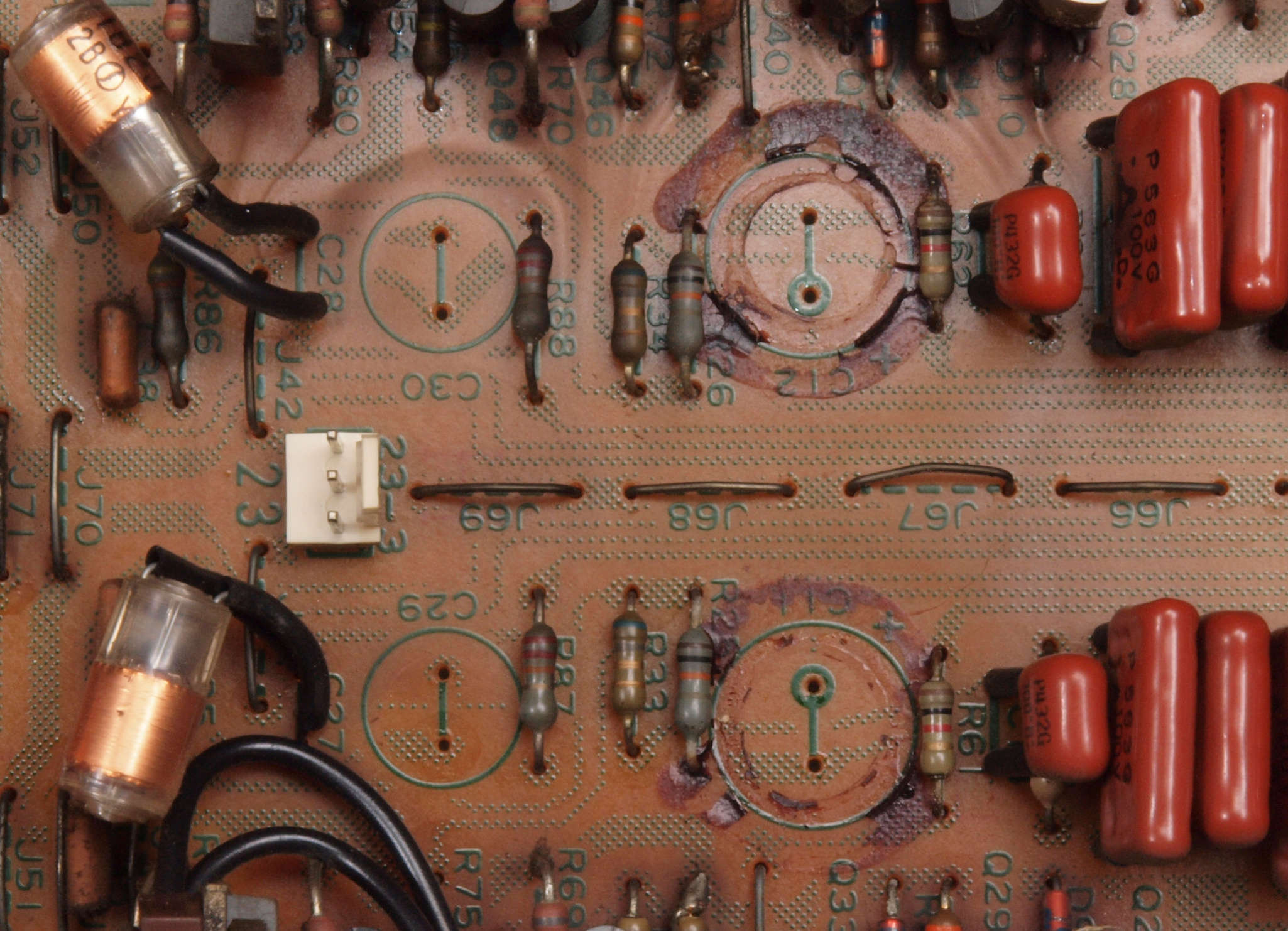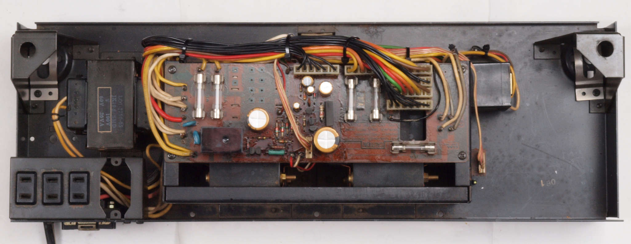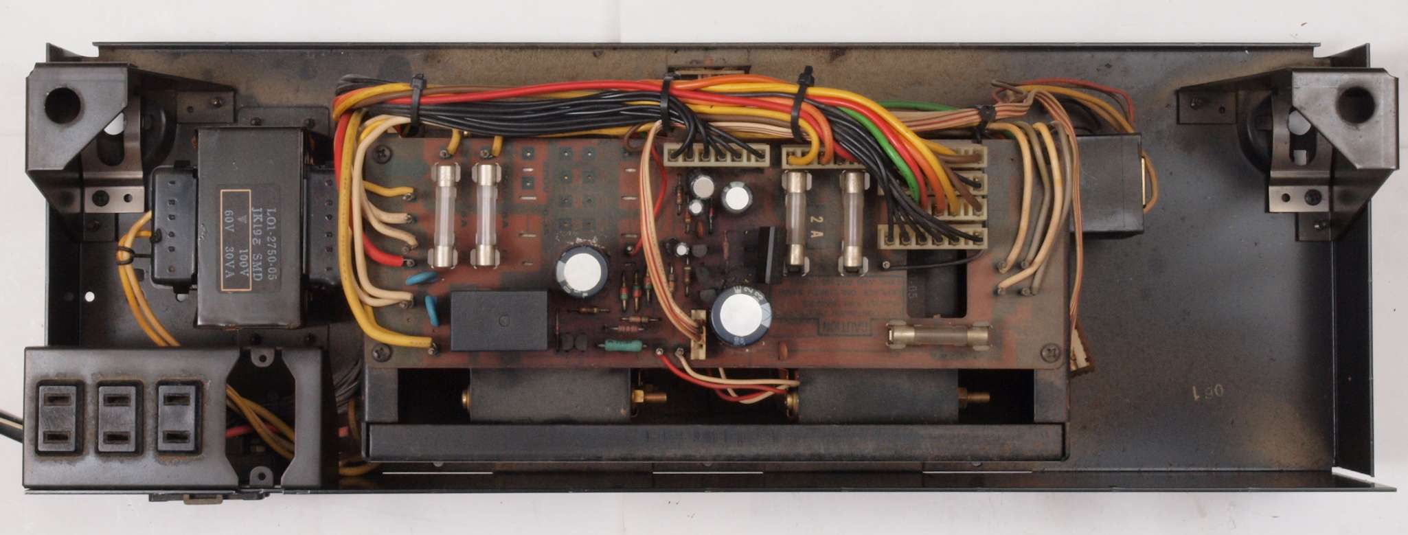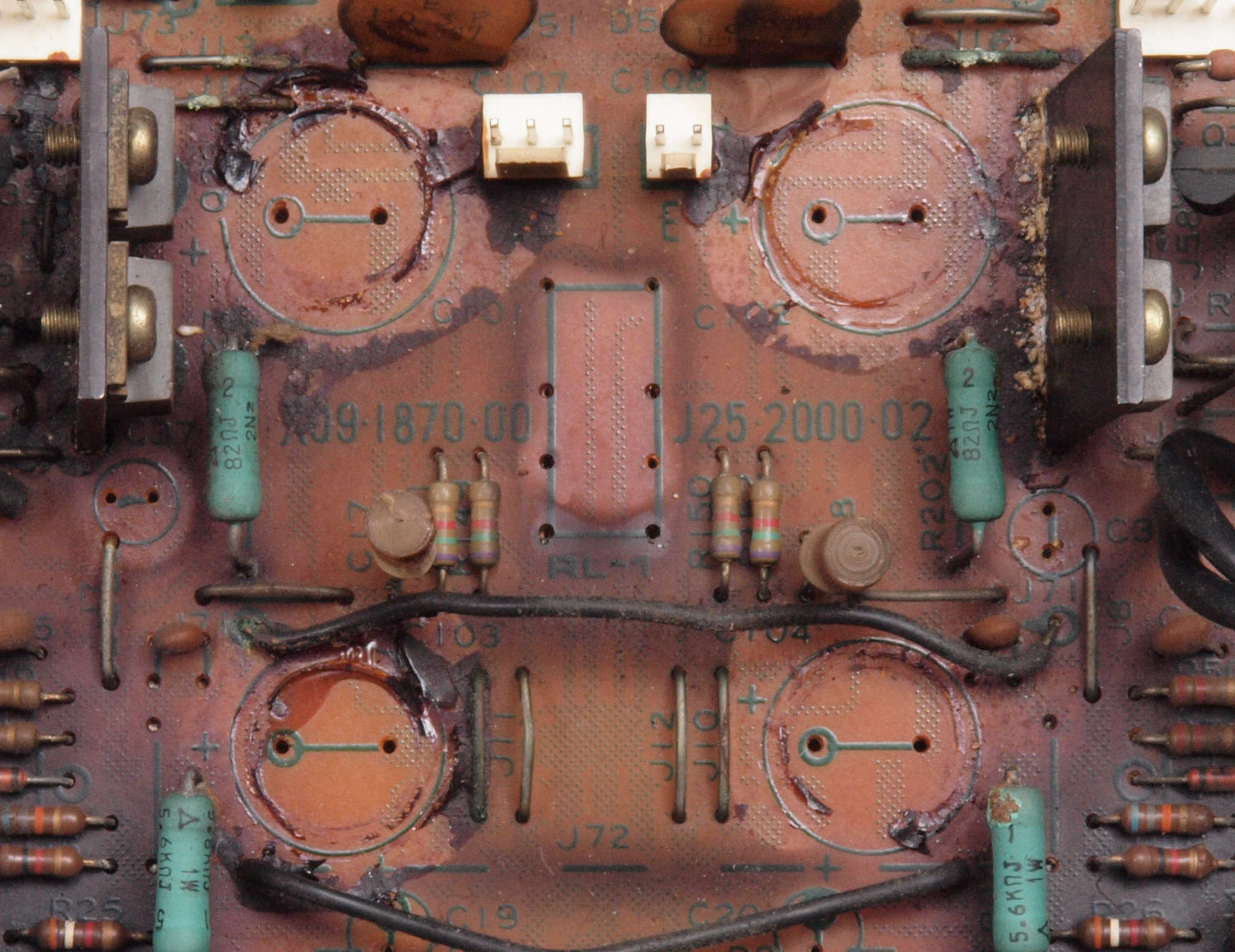 | A18. 点検中 上下蓋取り、上から見る。 EQ(イコライザー)アンプの電解コンデンサーが液漏れ。 | ||||||||||||||||||||||||||||||||||||||||||||||||