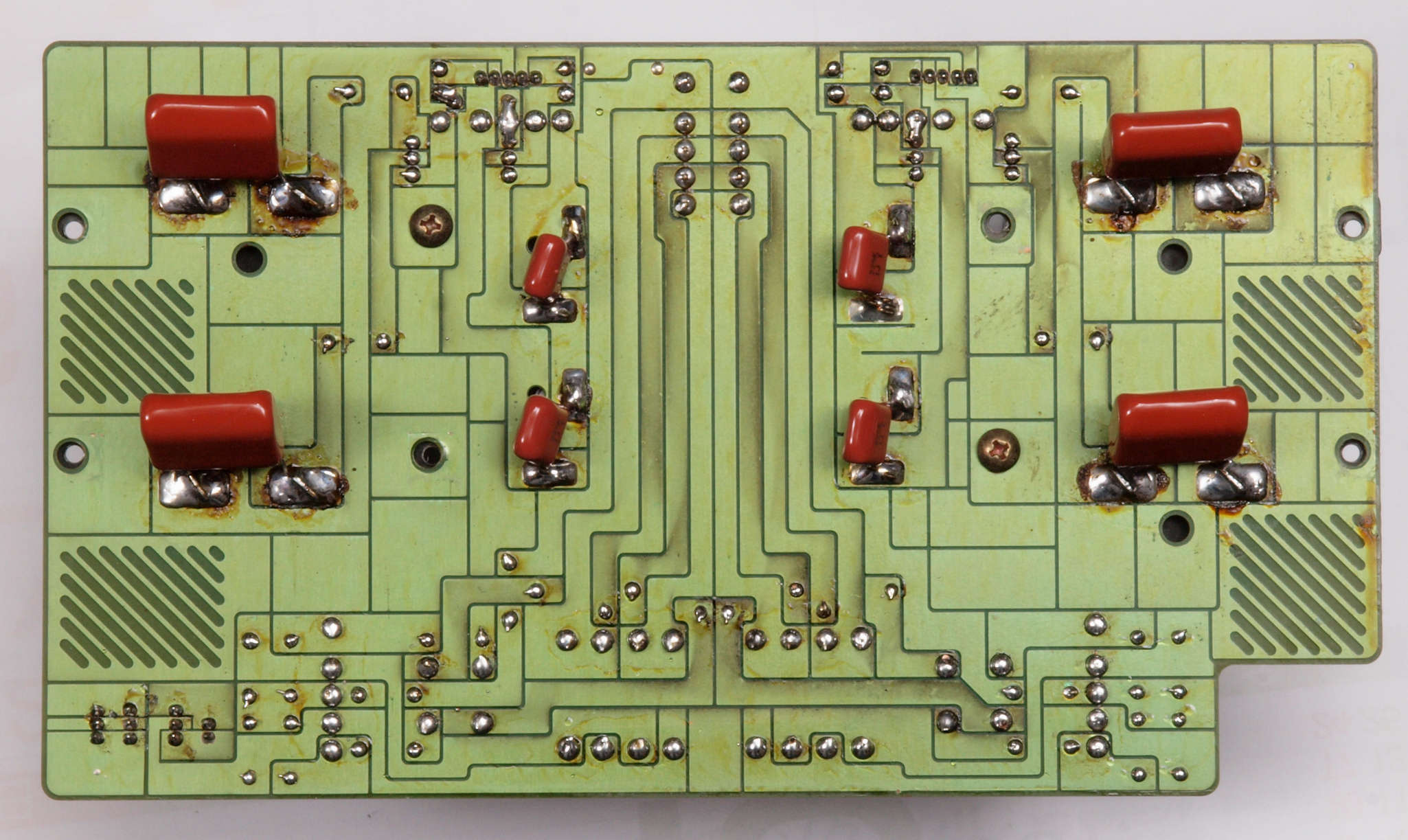 | C34. 修理(半田補正)後 ドライブAMP基板裏。 フイルムコンデンサー2個追加。 全ての半田をやり直す。 | ||||||||||||||||||||||||||||||||||||||||||||||||