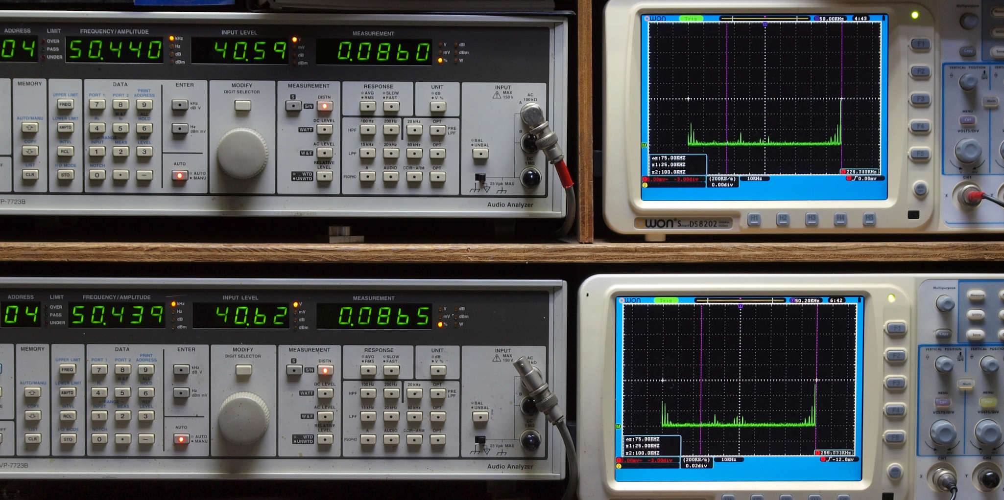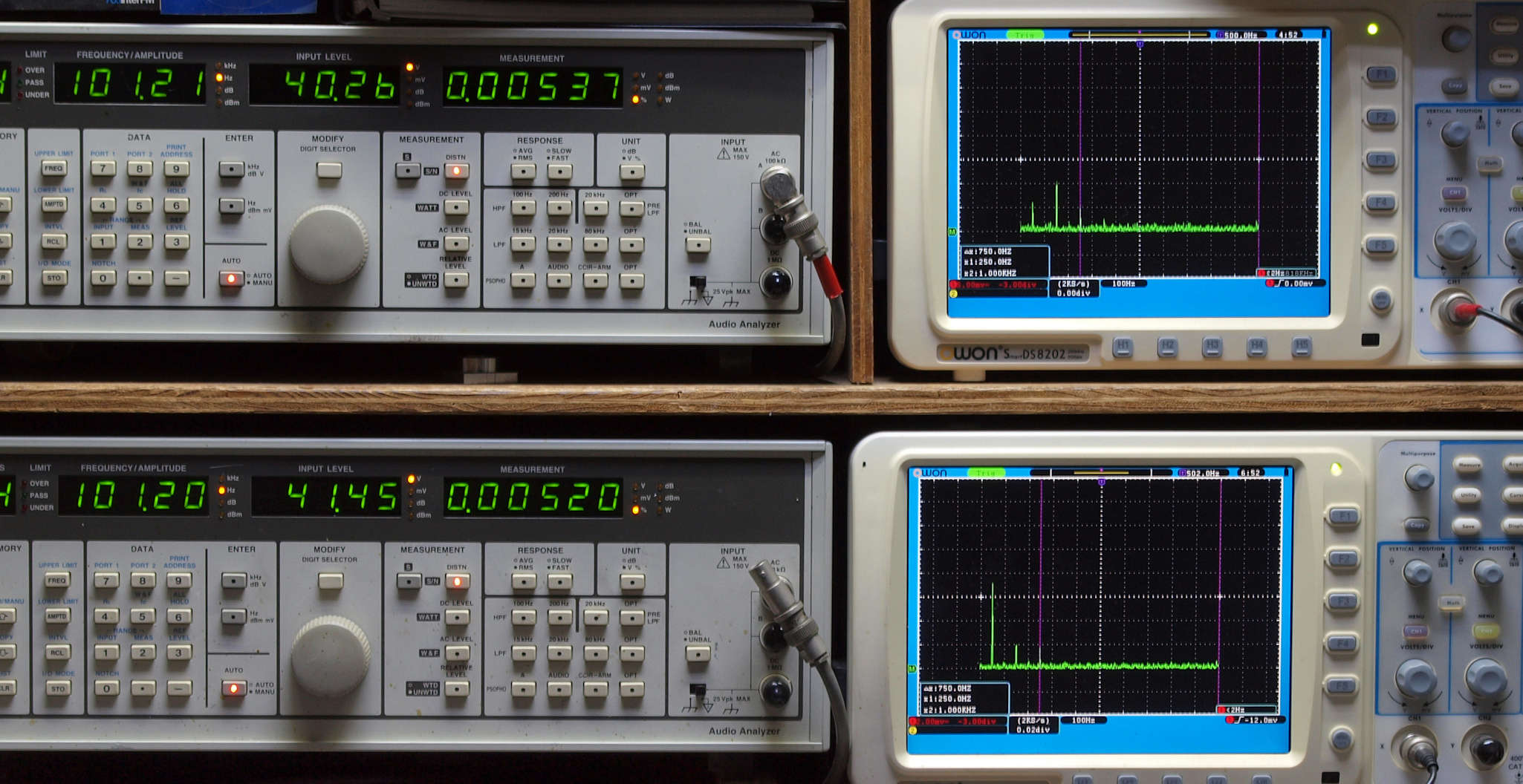 | E. 測定・調整。 画像をクリックすると、大きく(横幅2050ドット)表示されます。 E1. 出力・歪み率測定・調整 「見方」。 上段中 右側SP出力を「Audio Analyzer Panasonic VP−7723B」により測定。 表示LED、 左端=メモリーNo、 中左=周波数測定、 中右=出力電圧測定、 右端=歪み率測定。 上段右端 VP−7723Bの基本波除去出力を「owon SDS8202(200MHZ)」で「FFT分析」表示。 下段中 左側SP出力を「Audio Analyzer Panasonic VP−7723B」により測定。 表示LED、 左端=メモリーNo、 中左=周波数測定、 中右=出力電圧測定、 右端=歪み率測定。 下段右端 VP−7723Bの基本波除去出力を「owon SDS6062(200MHZ)」で「FFT分析」表示。 下段左端 オーディオ発振器 VP−7201A より50Hz〜100kHzの信号を出し(歪み率=約0.003%)、ATT+分配器を通し、AMPに入力。 よって、ダイアル設定出力レベルより低くなります。測定機器の仕様や整備の様子はこちら、「VP−7723B」「VP−7201A」。 FFT画面の見方はこちら。 |