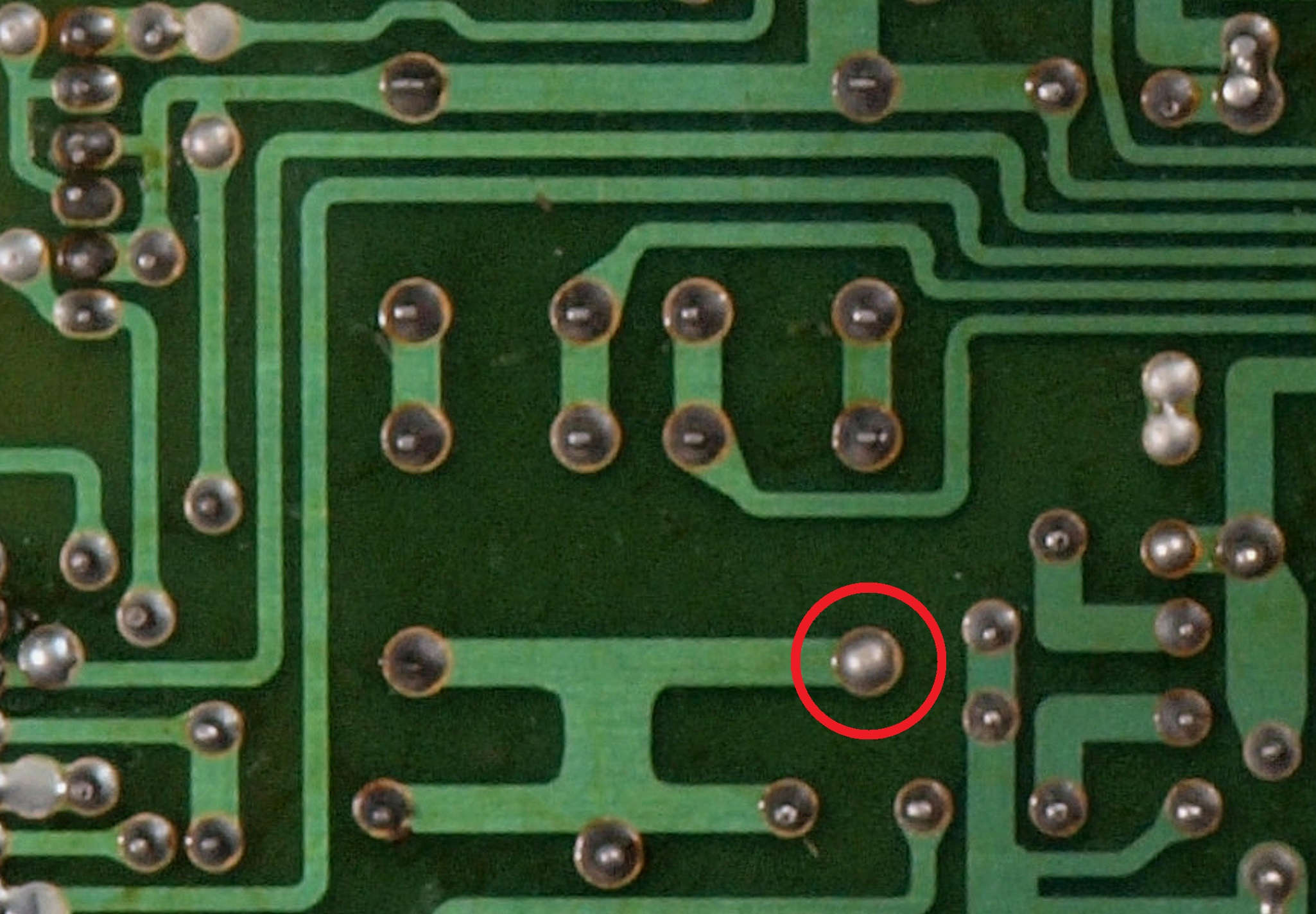 L−02A. 21台目 終段・プロテクト基板裏。SP接続リレーの足(端子)の半田がおかしい! |