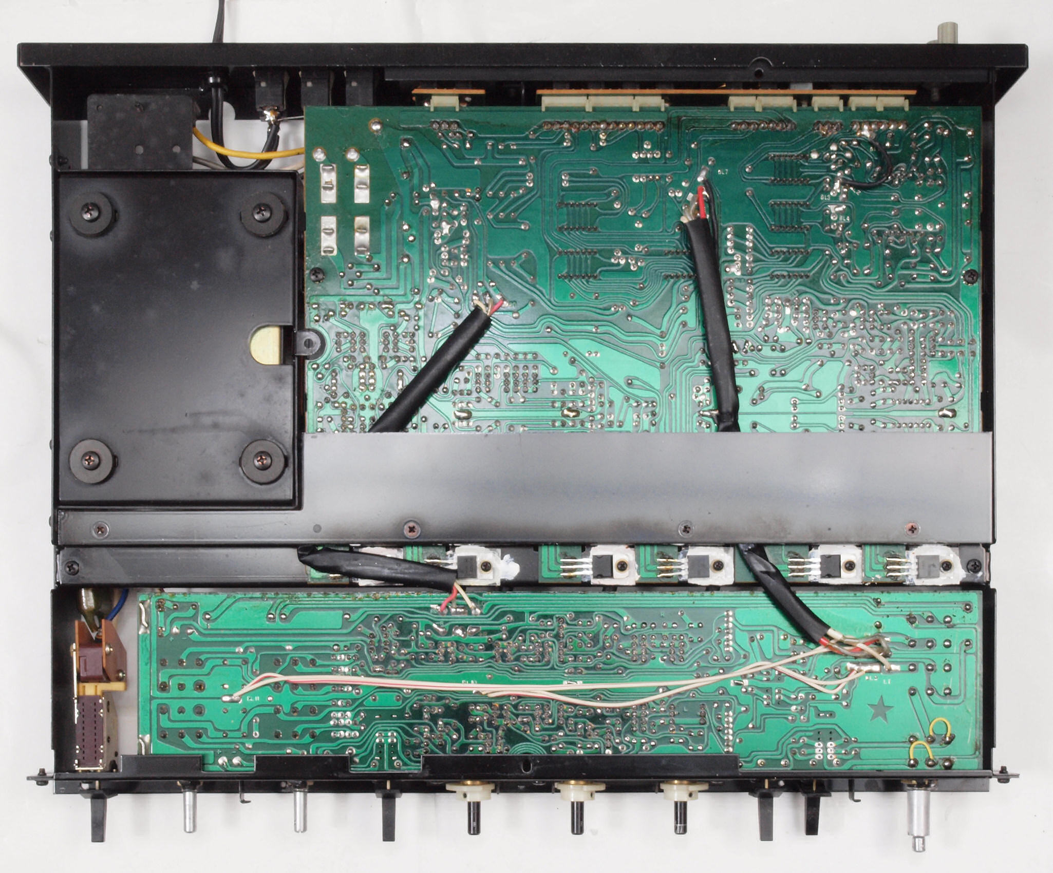 | A2A. 点検中 上下カバー、シールドを取り、下から見る。 トーンアンプ・ヤマハオリジナルの出力のフイルムコンデンサーが電解コンデンサーに交換されている。 | ||||||||||||||||||||||||||||||||||||||||||||||