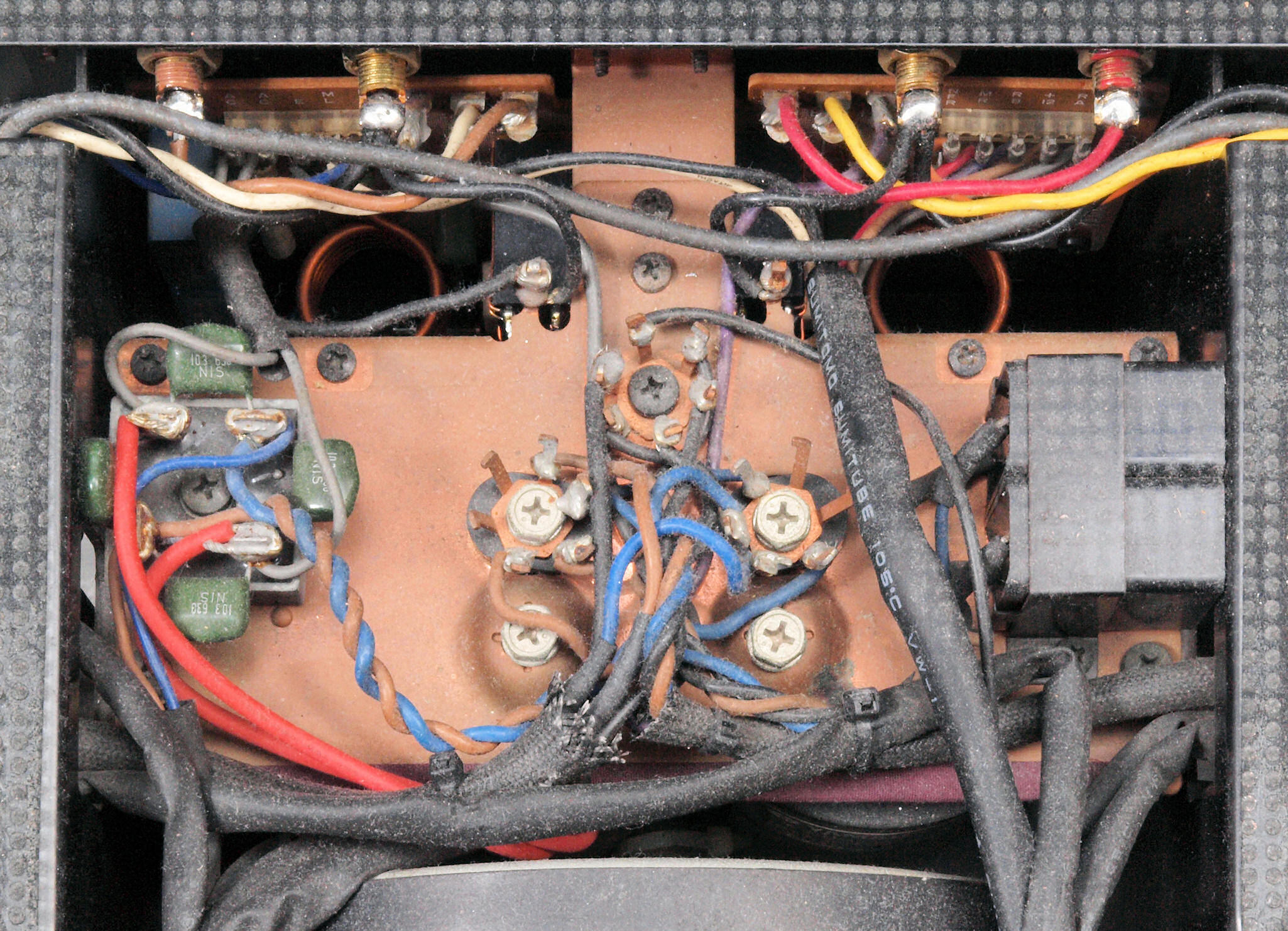 | A18. 点検中 上下蓋を取り、上から見る。 電源ブロック電解コンデンサー下周り配線を見る。 | ||||||||||||||||||||||||||||||||||||||||