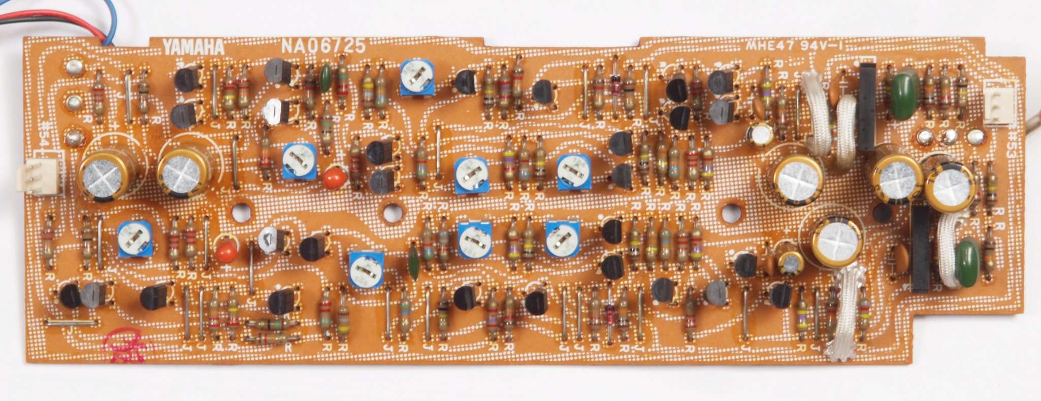 C54.修理後 FlatAMP基板 半固定VR2個、電解コンデンサー15個、フイルムコンデンサー11個、足黒TR(トランジスター)18個交換