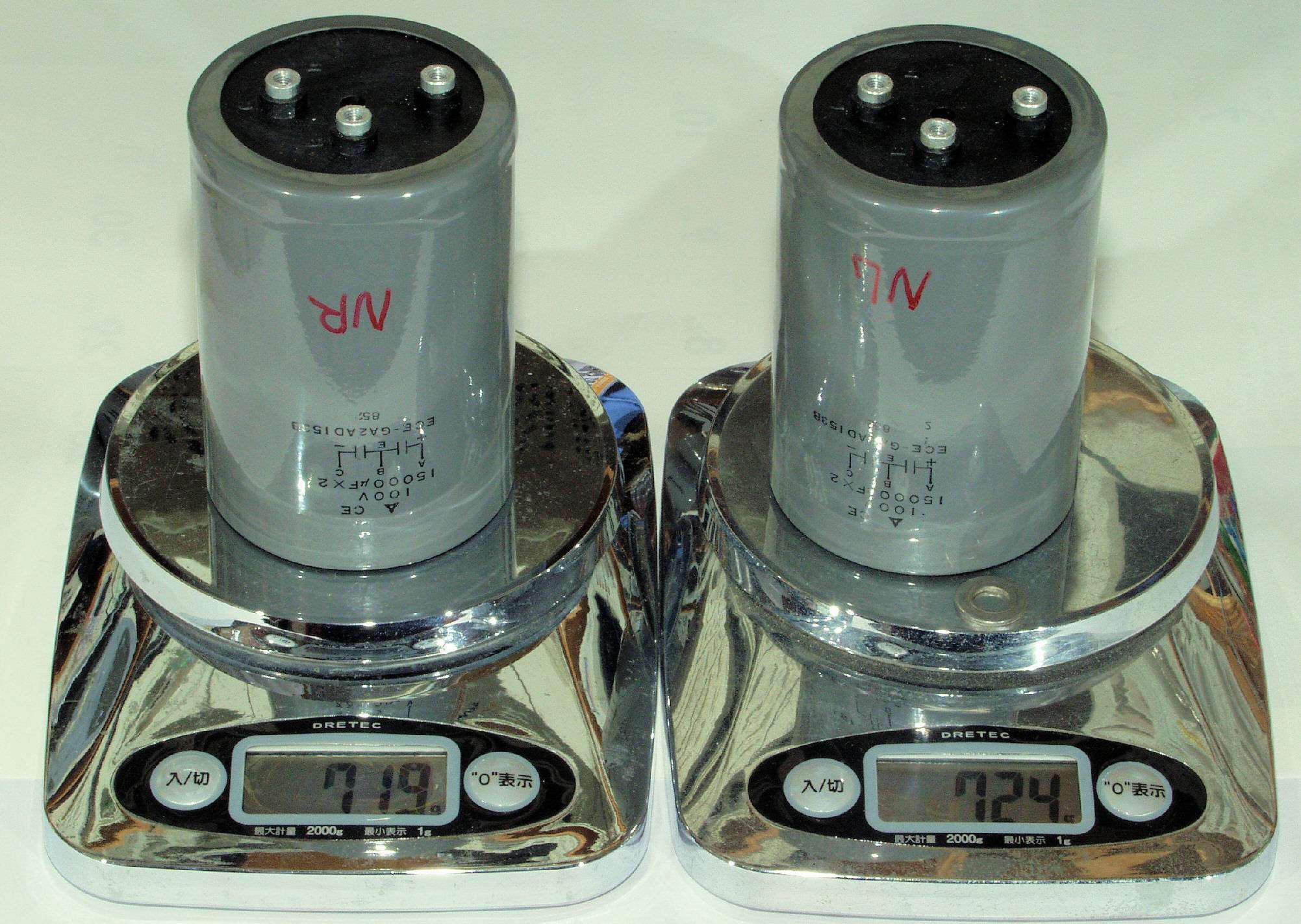 | A31. 重量測定。右=日立 15000μ/100V。 2本、左=Panasonic 22000μ/100V 2本で560g | ||||||||||||||||||||||||||||||||||||||||||||||||||||||||||||||||