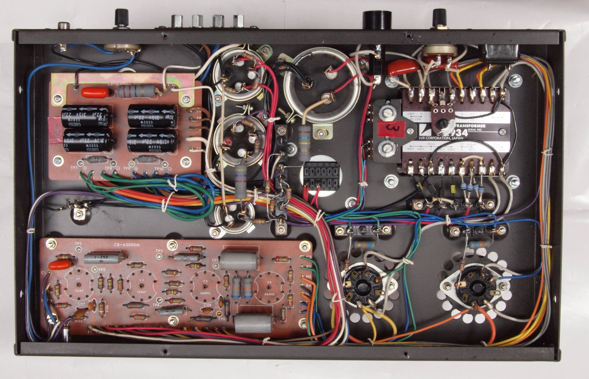 CA5 完成前上から見る。8045G2本、6240G2本、12AU7、12AX7。