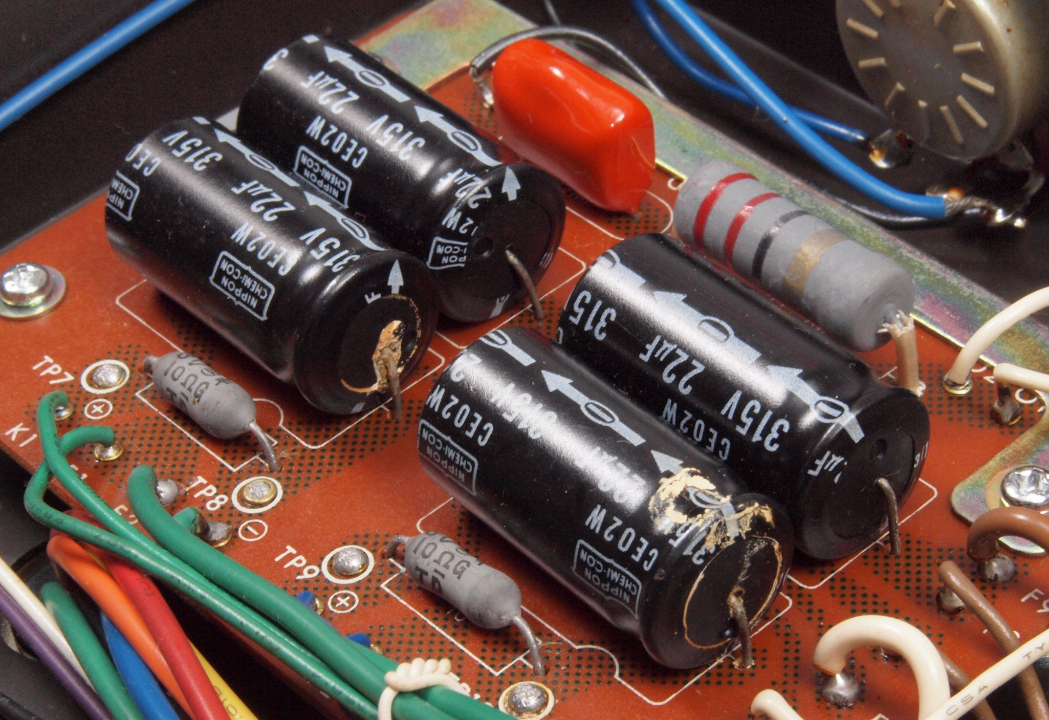 | C312. 修理前 出力トランス下のフイルター基板。電解コンデンサー2個が液漏れしている。 | ||||||||||||||||||||||||