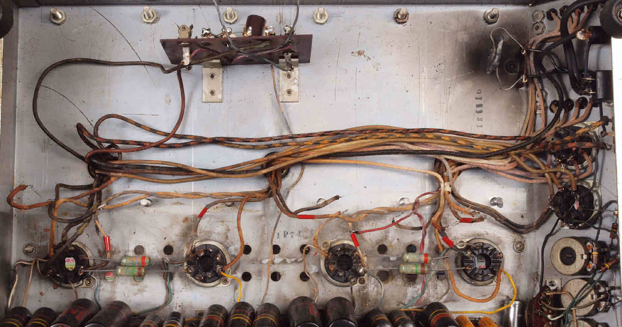 | C51. 修理前 ブロック電解コンデンサーとチョークトランスのシャーシ。 | ||||||||||||||||||||||||