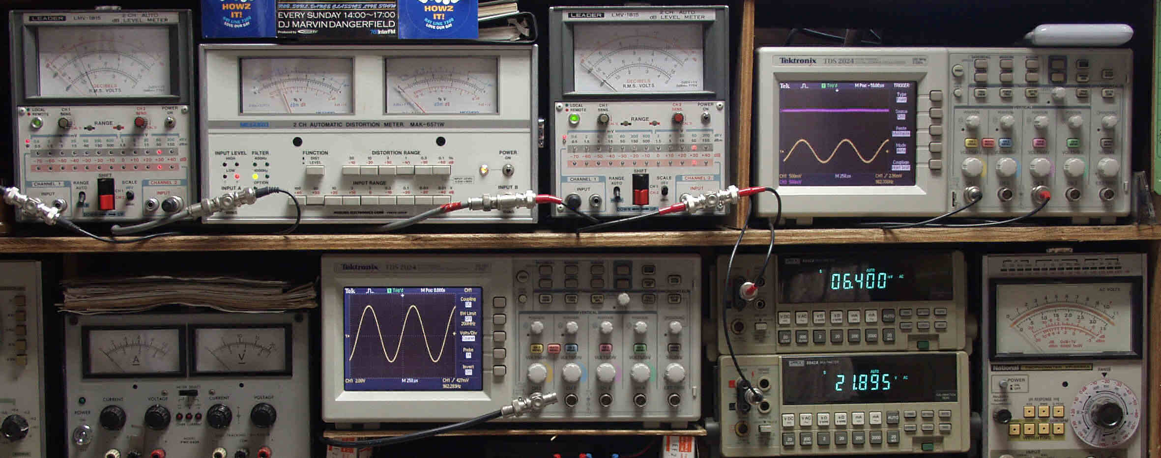 | E. 調整・測定 E1. 調整・出力測定 <見方> 下段左端 オーディオ発振器より400HZ・1KHZの信号を出し(歪み率=約0.003%)これをAMPに入力し、出力を測定 下段中左 オシロ=入力波形(オーディオ発振器のTTLレベル) 下段中右上=周波数計 上段左端 電圧計=L側出力電圧測定、黒針のみ使用 上段中左 歪み率計=出力の歪み率測定 左メータ=L出力、右メータ=R出力 上段中右 電圧計=R側出力電圧測定、赤針のみ使用 上段右端 オシロ=出力波形 上=R出力、下=L出力(実際にはRL電圧計の出力「Max1V」を観測) 下段中右上 デジタル電圧計=R出力電圧測定 下段中右下 デジタル電圧計=L出力電圧測定 個人輸入器なので電源電圧は115V−50HZ |