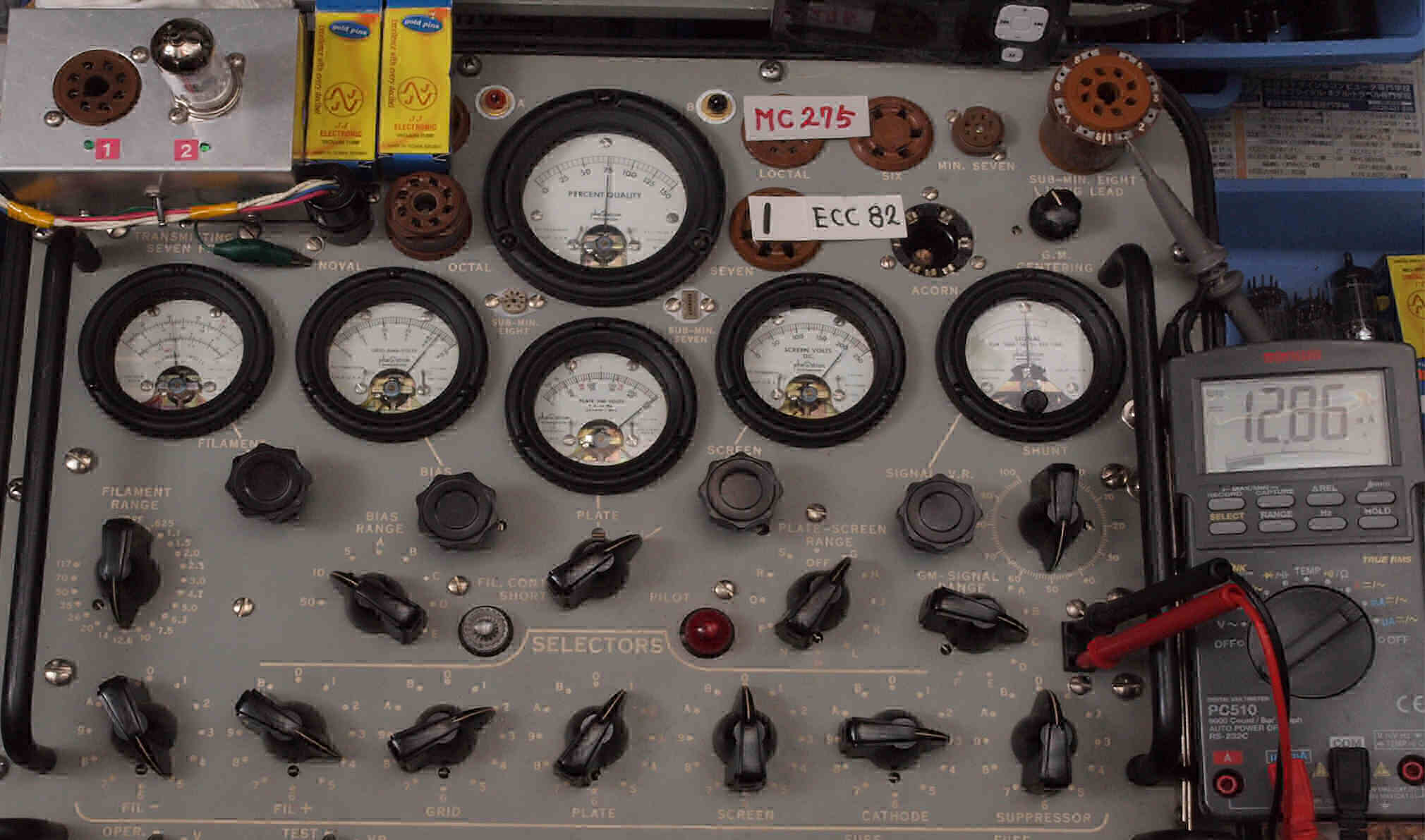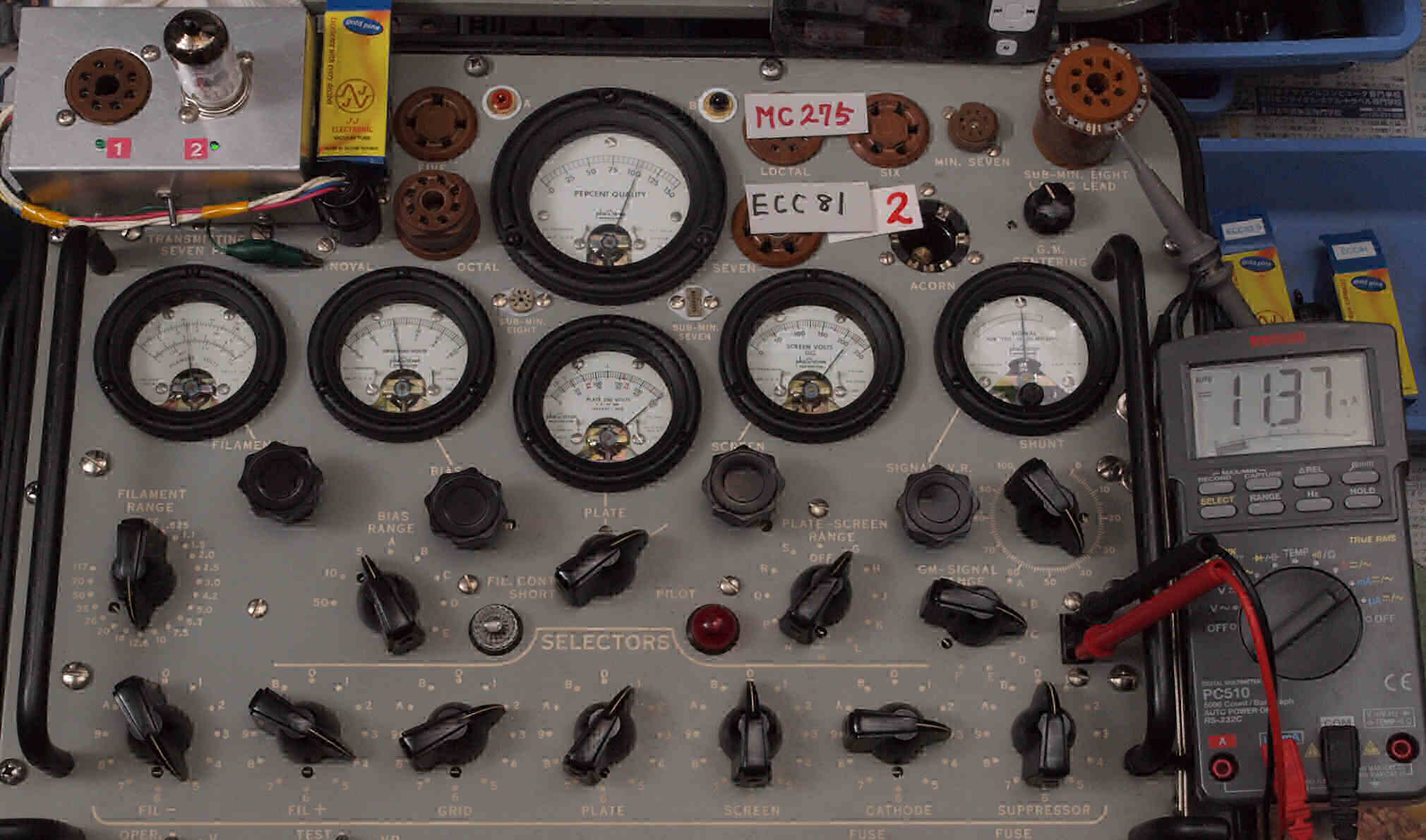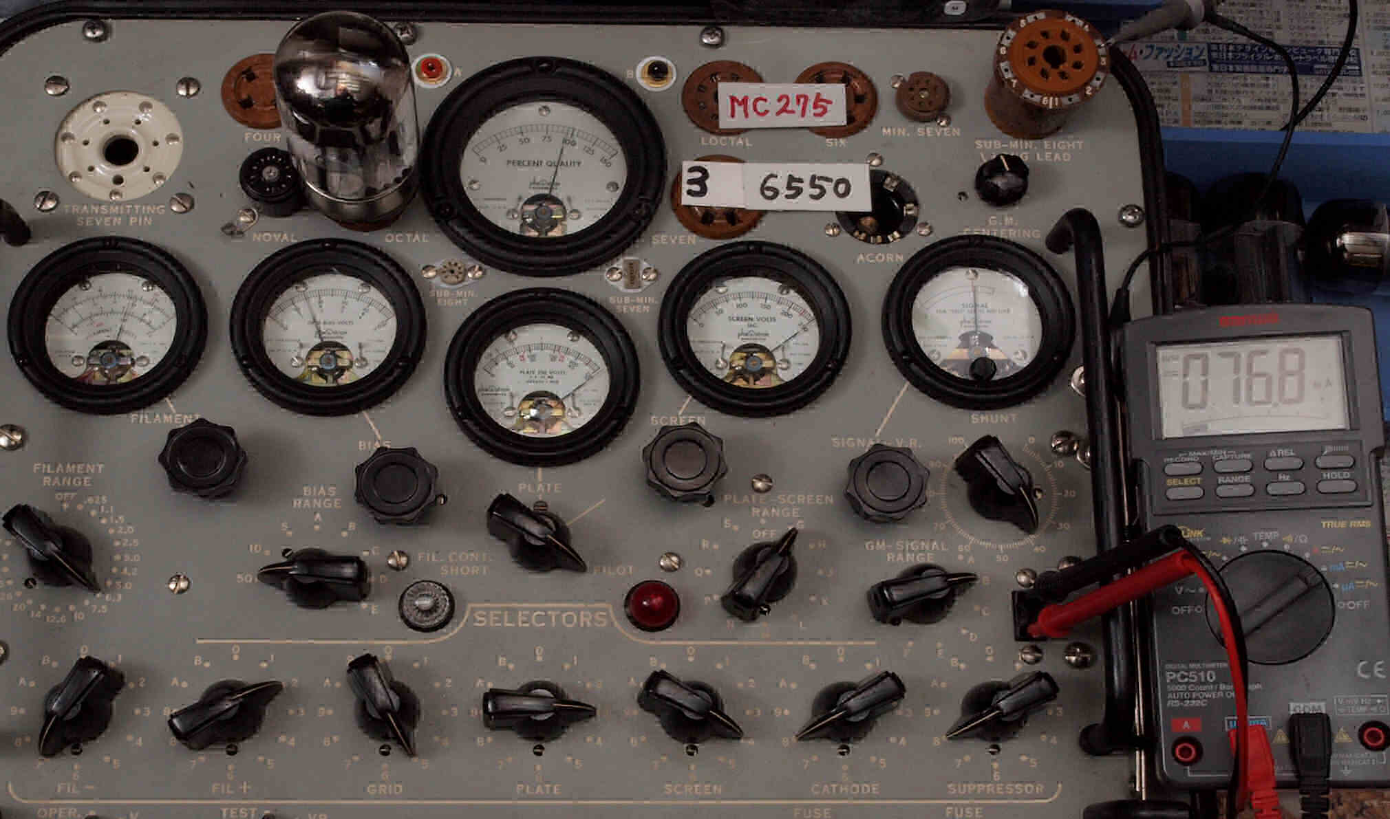 | V21. 購入真空管「ECC82」ユニット1。 Gm測定=2800μmho、Ip=12.47mA。 測定条件、「Ep=250V、Eg1=−8.5V」、 Cレンジ=6000μmhoレンジでの測定。 |