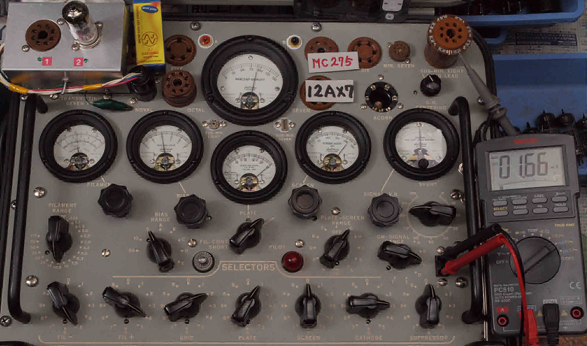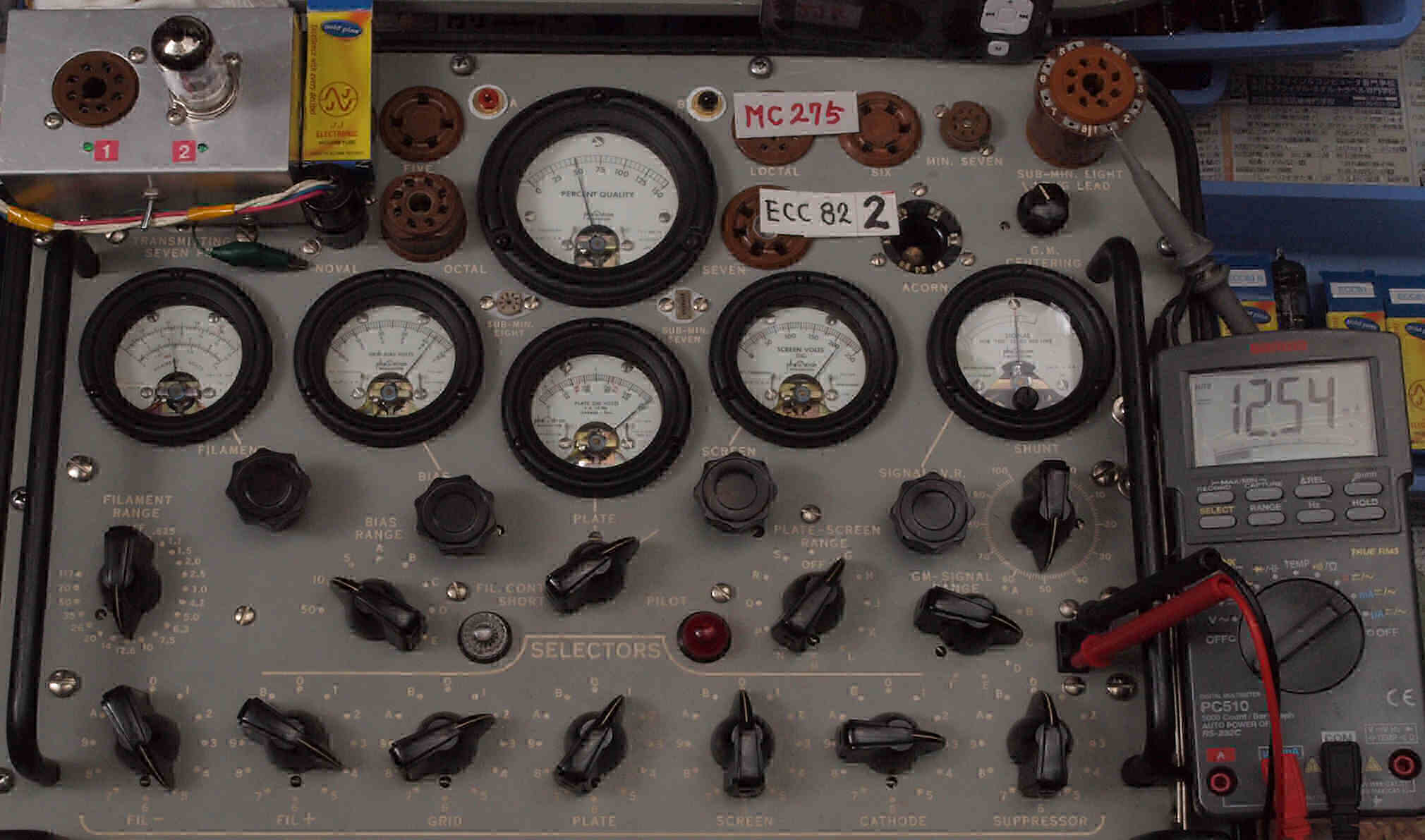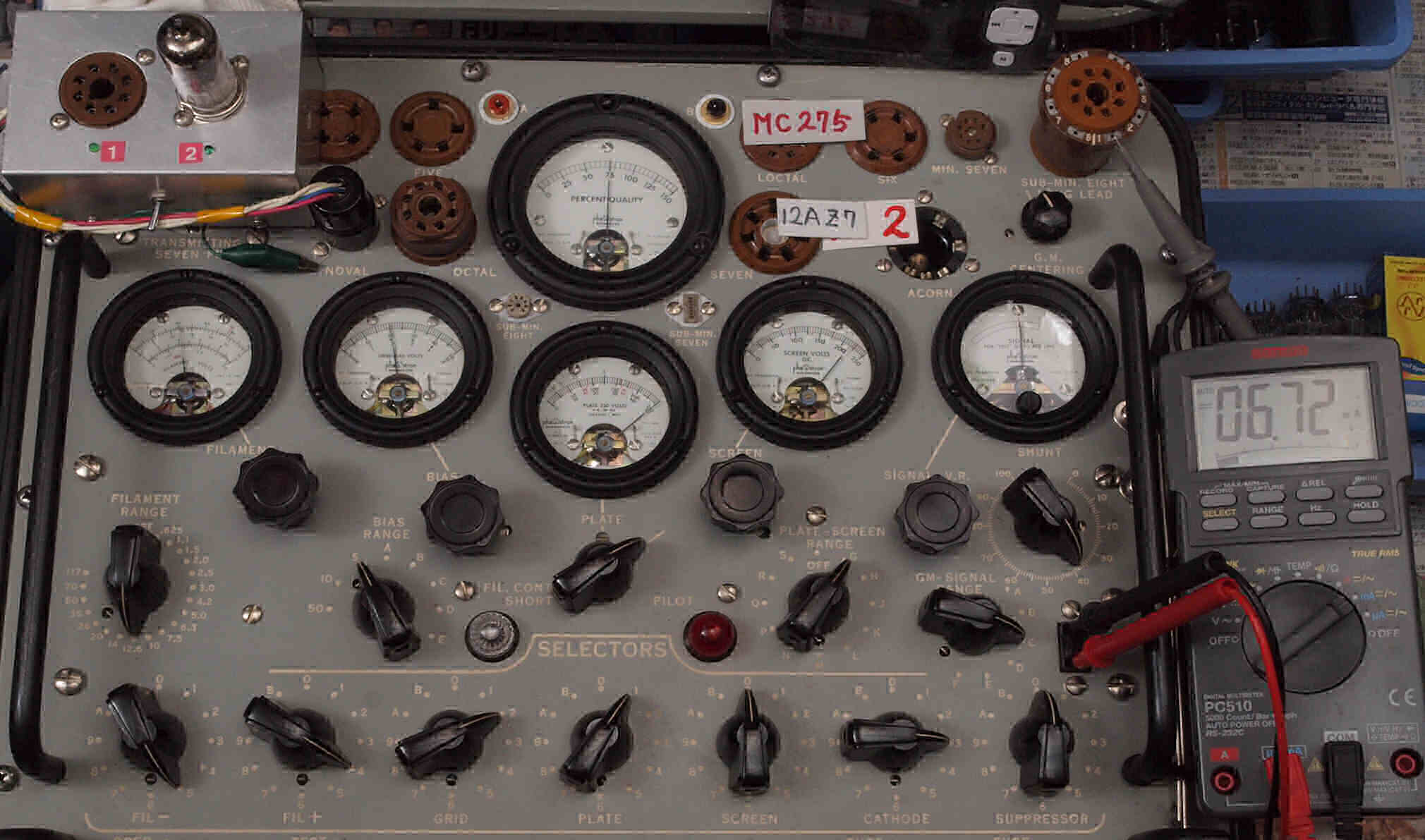| V21. 購入真空管「ECC82」ユニット1。 Gm測定=2800μmho、Ip=12.47mA。 測定条件、「Ep=250V、Eg1=−8.5V」、 Cレンジ=6000μmhoレンジでの測定。 |