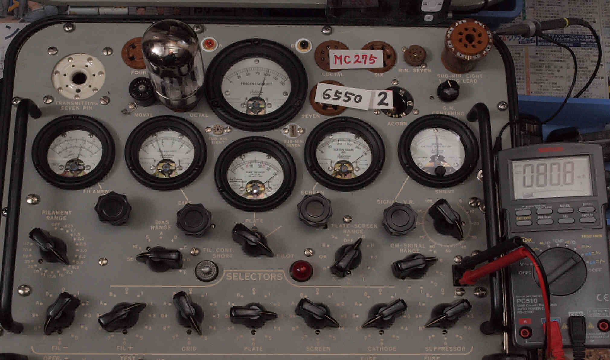 | U81. 付属真空管「6550」1本目。 Gm測定=9200μmho、Ip=75.8mA。 測定条件、「Ep=250V、Esg=250VEg1=−14V」。 Bレンジ=15000μmhoレンジでの測定。 |