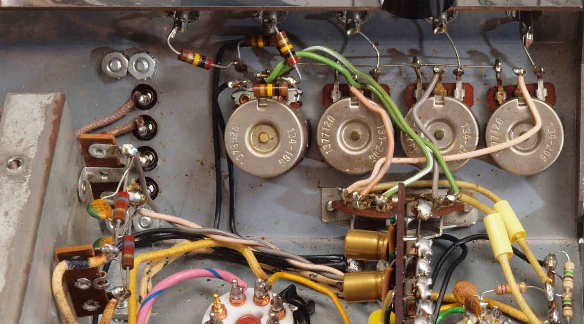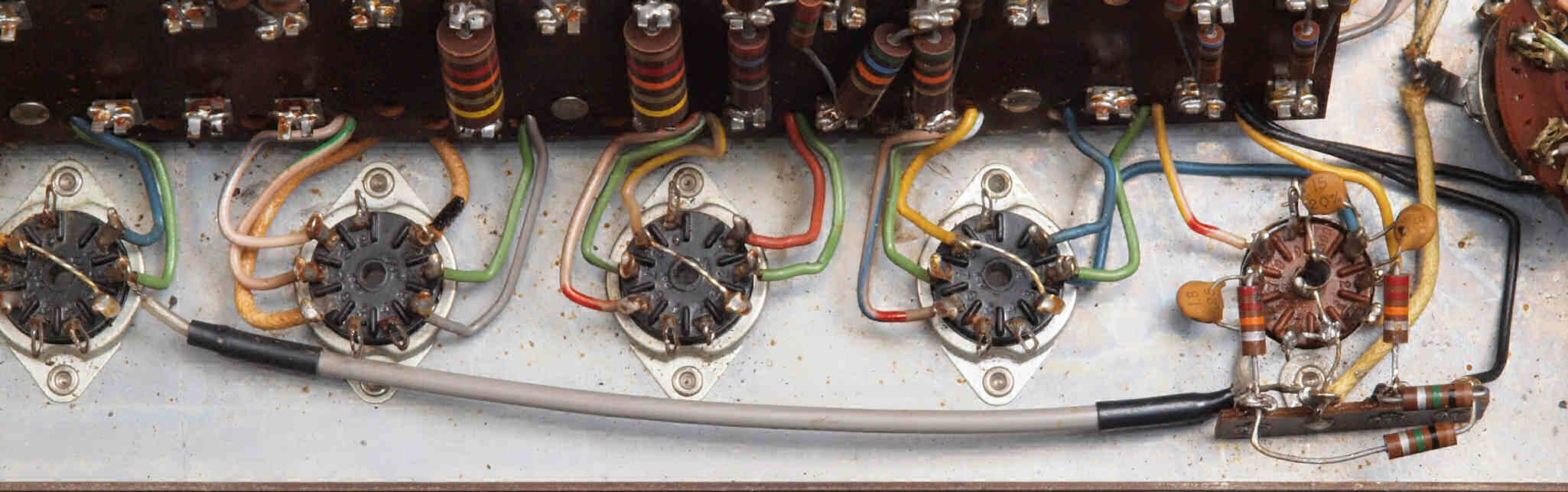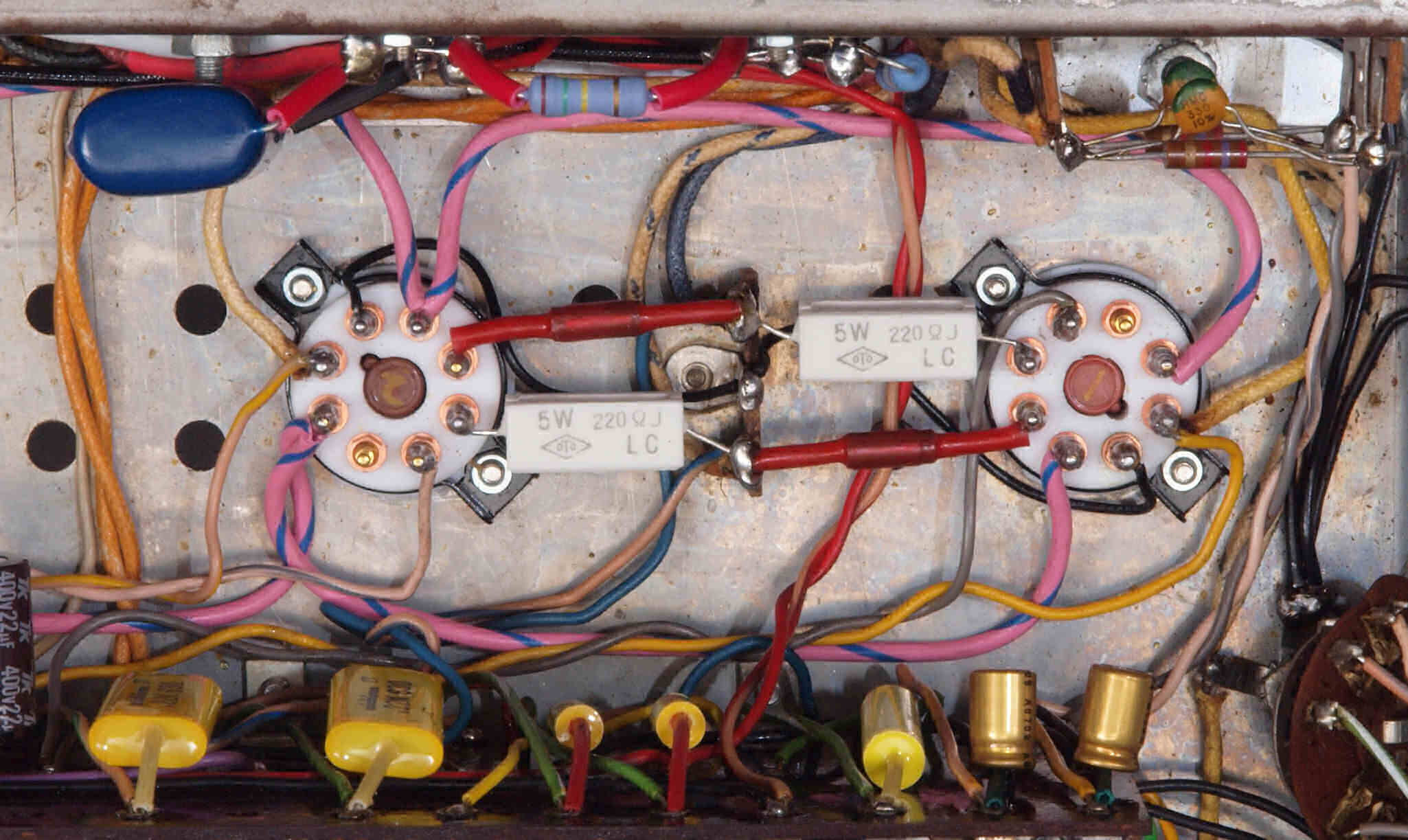 | A322. 点検中 下ケースを取り下から見る。 KT88のスクリーン抵抗が交換されている。 | ||||||||||||||||||||||||
