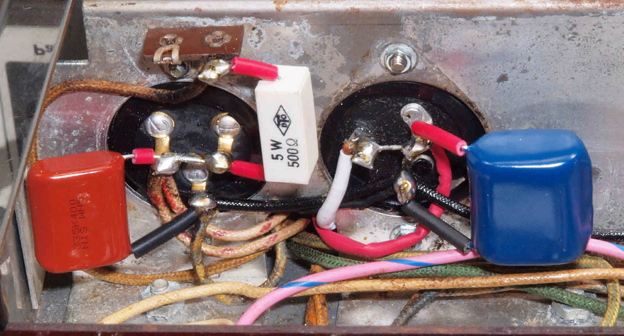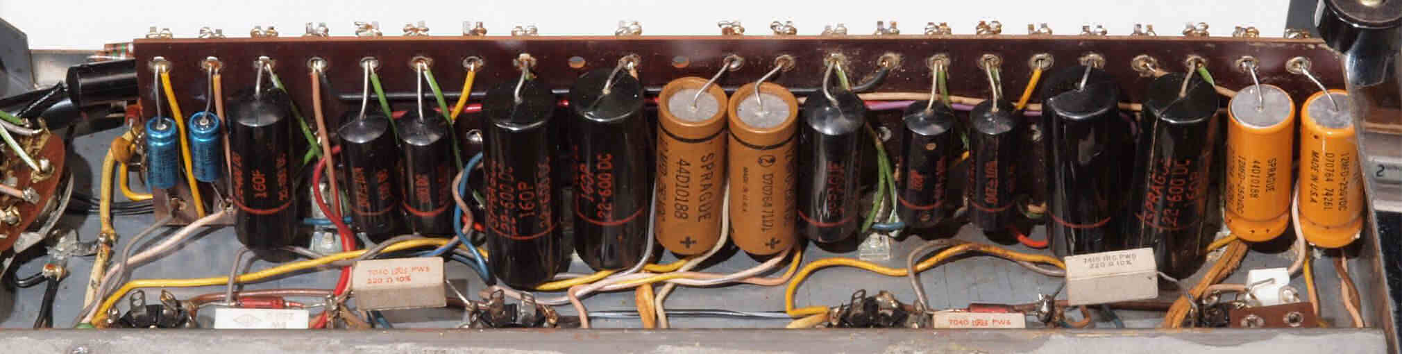 | C76. 修理後 電解コンデンサーシャシを取りし、端子を見る。下のK線がアース母線。 | ||||||||||||||||||||||||