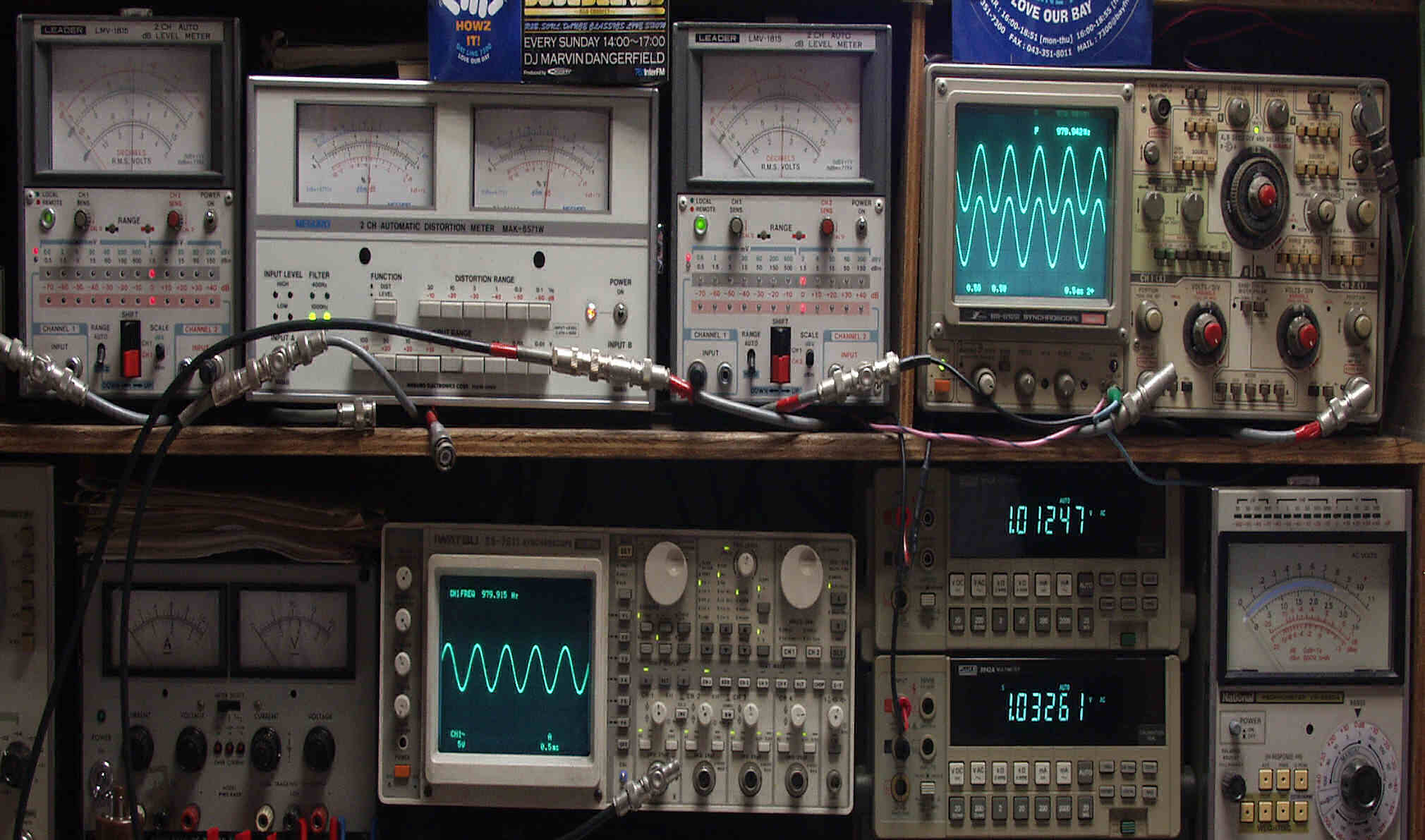 上段中左 歪み率計=出力の歪み率測定 左メータ=L出力、右メータ=R出力