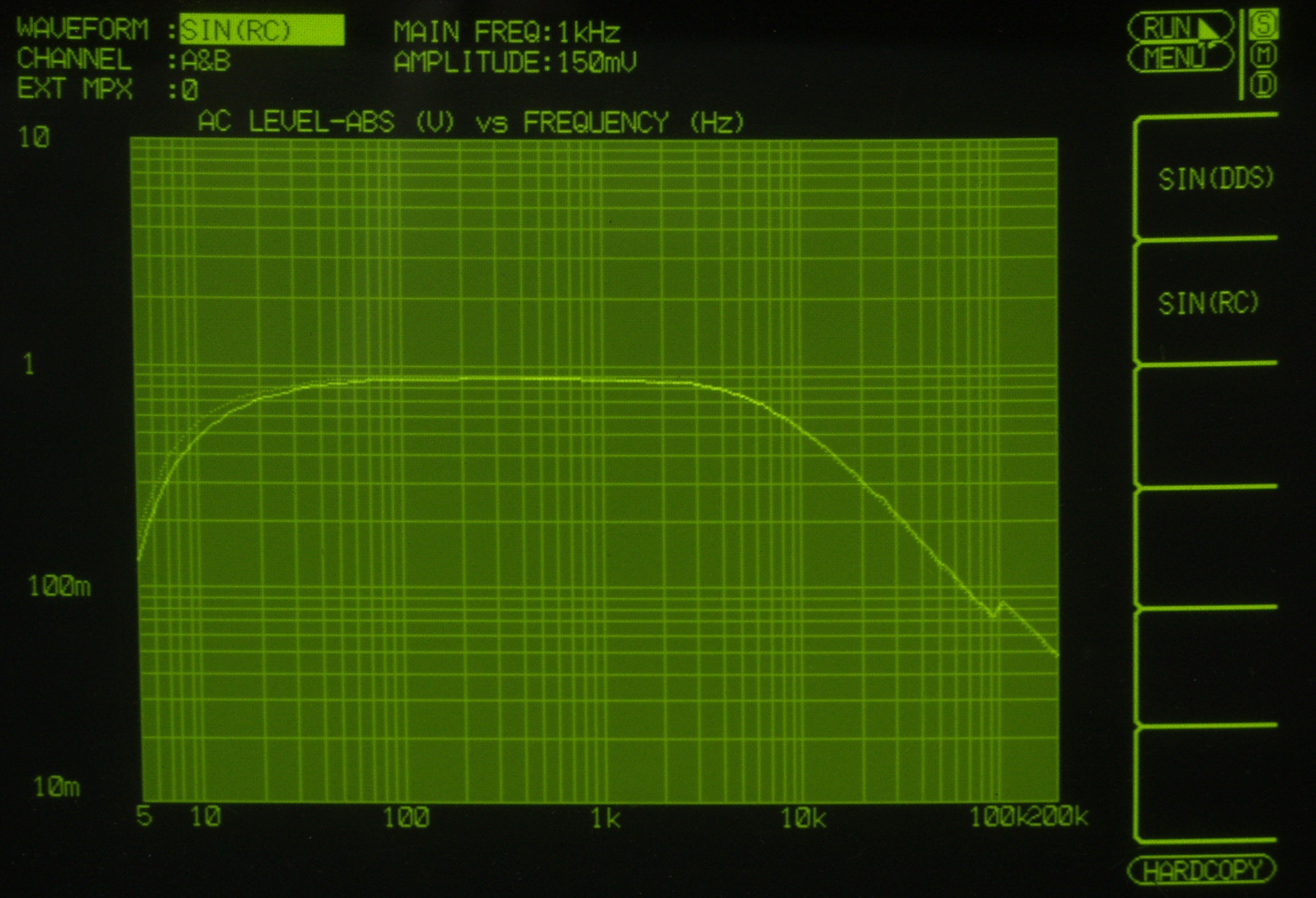 AUX入力端子へ150mV一定入力 VRはmax  左出力=薄(細い)色 右出力=濃い(太い)色