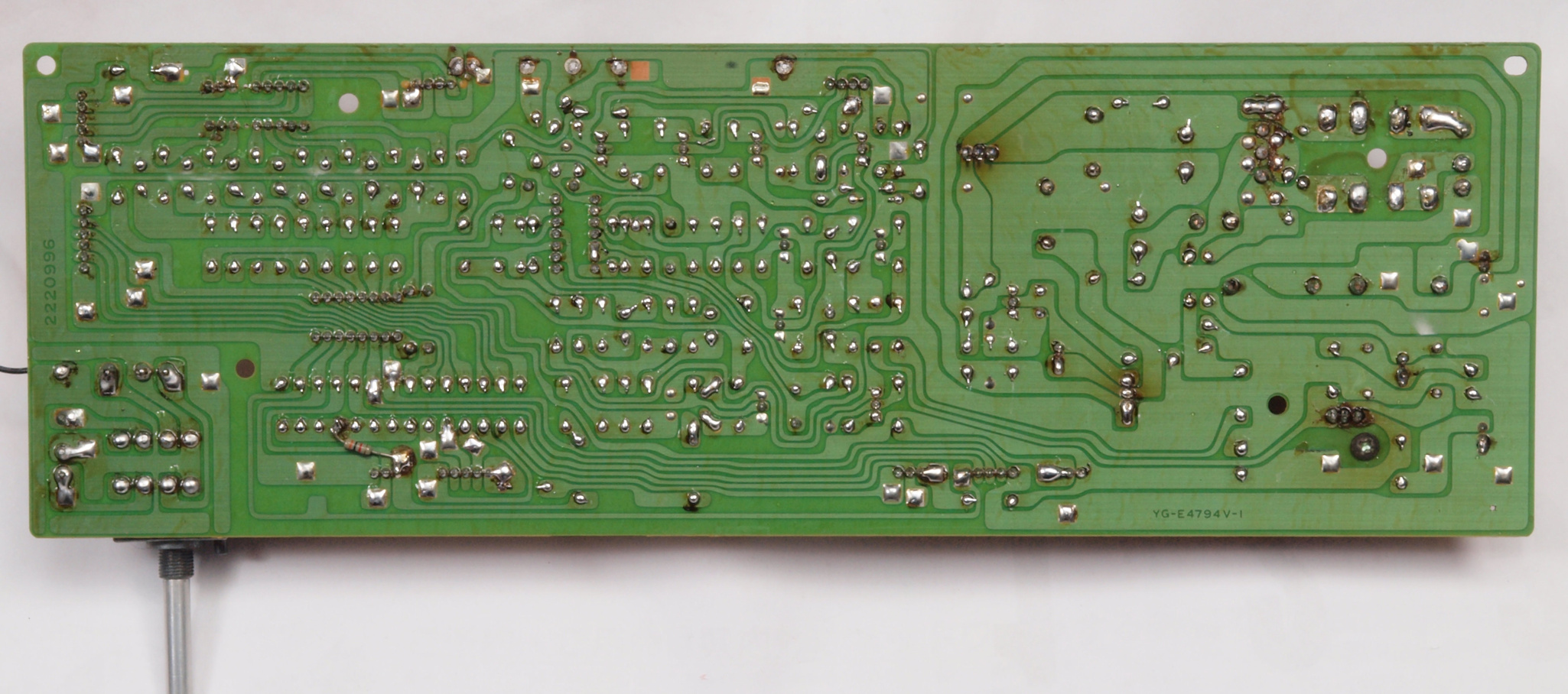 C212. 修理中 EQ−AMP基板。 トルエン溶媒の接着剤。錫メッキジャンパー線が腐食している。