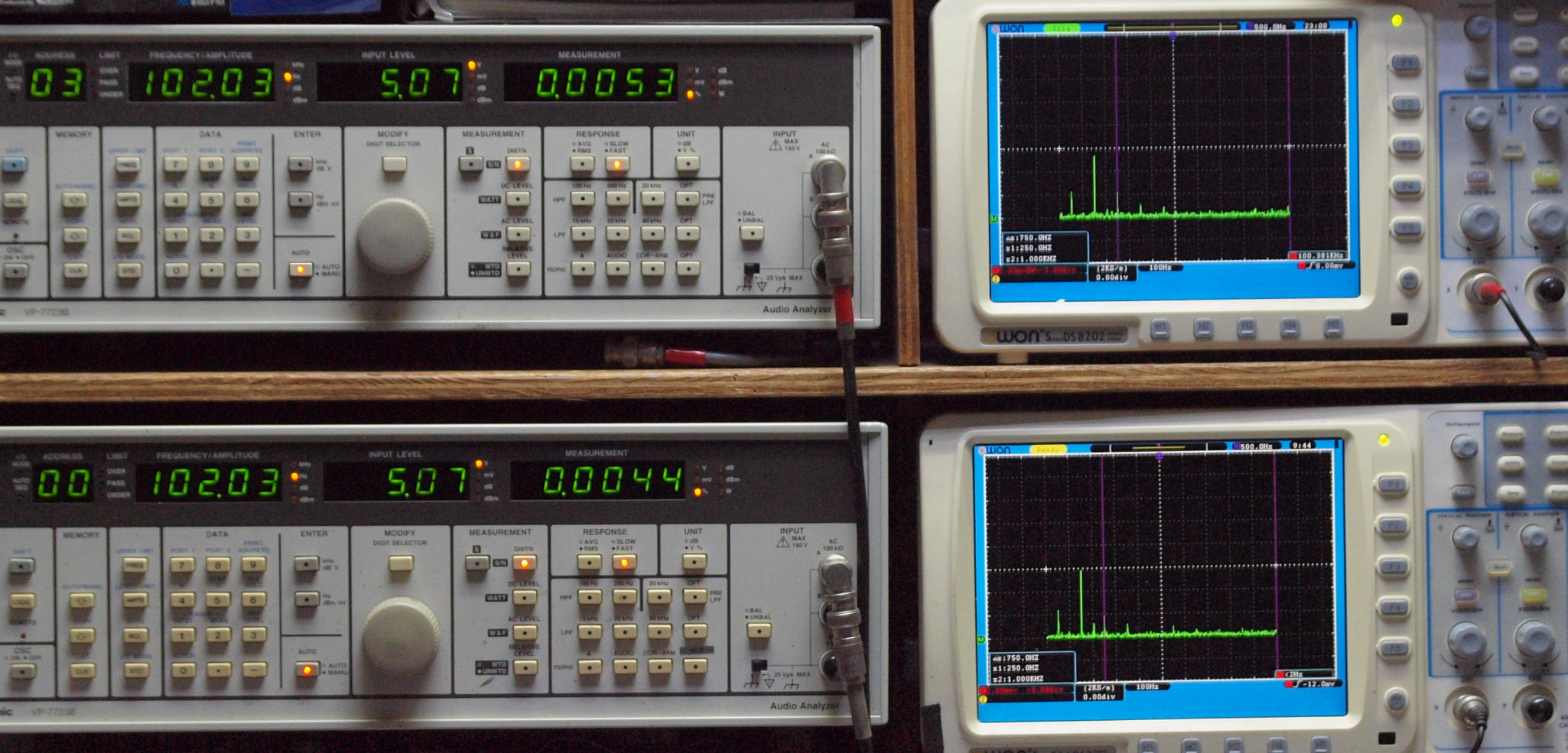 | E. 調整・測定。 画像をクリックすると、大きく(横幅2050ドット)表示されます。 E0. 出力・歪み率測定・調整。 「見方」。 上段中 右側出力を「Audio Analyzer Panasonic VP−7723B」により測定。 表示LED、 左端=メモリーNo、 中左=周波数測定、 中右=出力電圧測定、 右端=歪み率測定。 上段右端 VP−7723Bの基本波除去出力を「owon SDS8202(200MHZ)」で「FFT分析」表示。 下段中 左側出力を「Audio Analyzer Panasonic VP−7723B」により測定。 表示LED、 左端=メモリーNo、 中左=周波数測定、 中右=出力電圧測定、 右端=歪み率測定。 下段右端 VP−7723Bの基本波除去出力を「owon SDS6062(200MHZ)」で「FFT分析」表示。 下段左端 オーディオ発振器 VP−7201A より50Hz〜100kHzの信号を出し(歪み率=約0.003%)、ATT+分配器を通し、AMPに入力。 よって、ダイアル設定出力レベルより低くなります。測定機器の仕様や整備の様子はこちら、「VP−7723B」「VP−7201A」。 FFT画面の見方はこちら。 |