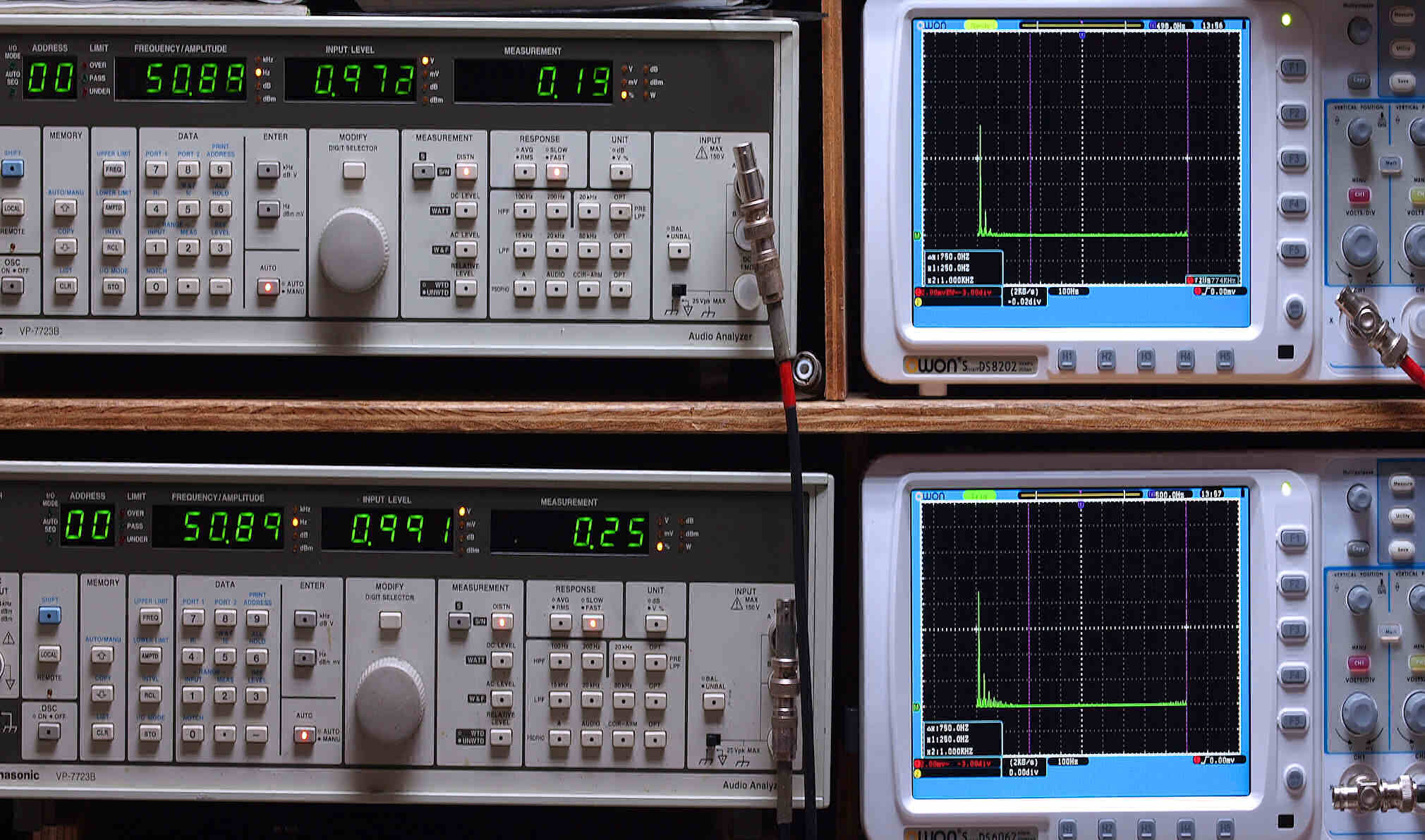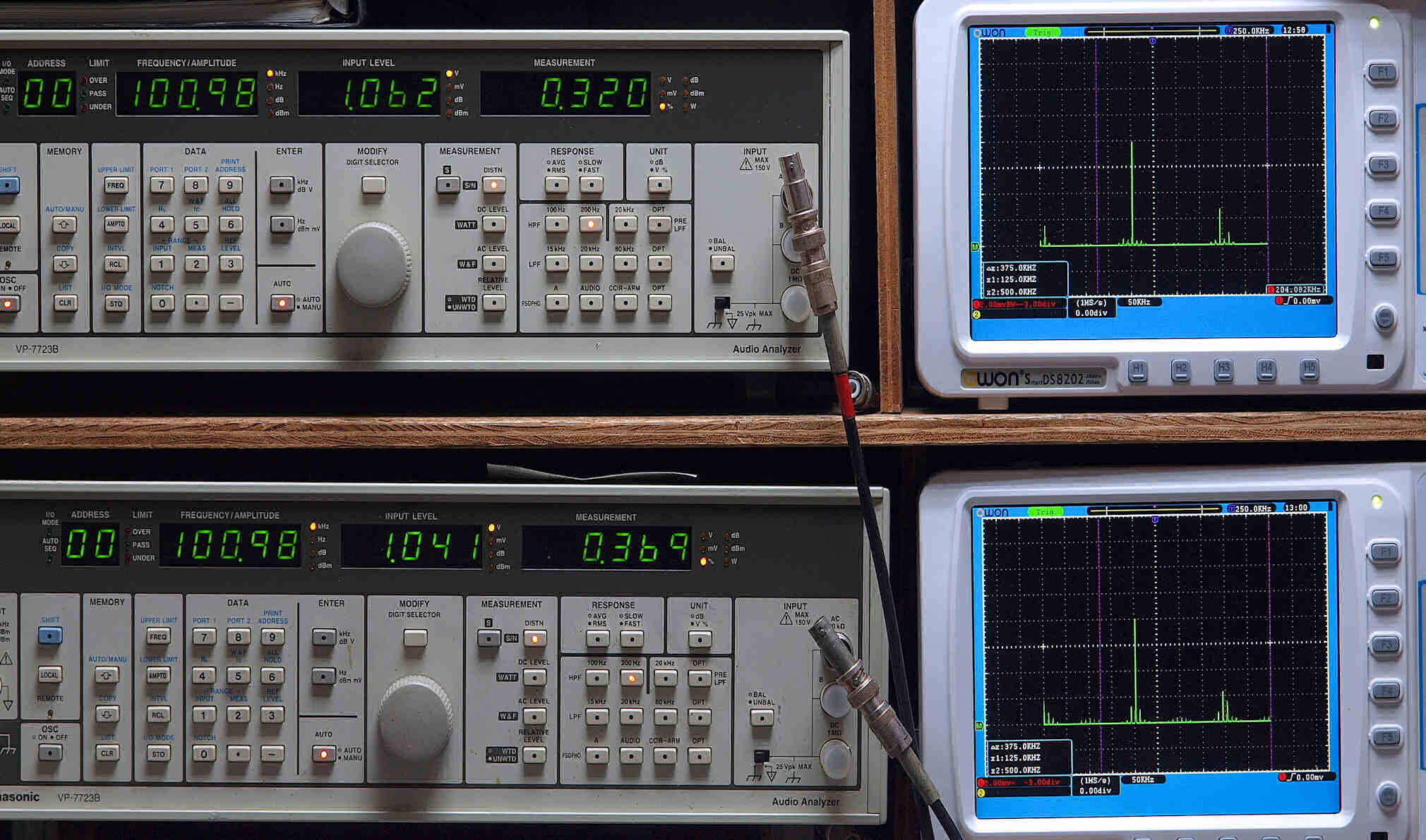 | E. 調整・測定。 画像をクリックすると、大きく(横幅2050ドット)表示されます。 E1. 出力、歪み調整・測定、電源電圧は100Vにて測定 「見方」。 上段中 右側出力を「Audio Analyzer Panasonic VP−7723B」により測定。 表示LED、 左端=メモリーNo、 中左=周波数測定、 中右=出力電圧測定、 右端=歪み率測定。 上段右端 VP−7723Bの基本波除去出力を「owon SDS8202(200MHZ)」で「FFT分析」表示。 VP−7723Bで増幅された物を分析していますので、レベルは相対的比較です。 よって、測定条件が変わる場合は比較検討は無意味です 下段中 左側出力を「Audio Analyzer Panasonic VP−7723B」により測定。 表示LED、 左端=メモリーNo、 中左=周波数測定、 中右=出力電圧測定、 右端=歪み率測定。 下段右端 VP−7723Bの基本波除去出力を「owon SDS6062(200MHZ)」で「FFT分析」表示。 下段左端 オーディオ発振器 VP−7201A より100Hz〜10kHzの信号を出し(歪み率=約0.003%)、ATT+分配器を通し、AMPに入力。 よって、ダイアル設定出力レベルより低くなります。測定機器の仕様や整備の様子はこちら、「VP−7723B」「VP−7201A」 下の100kHz入力は帯域外なので、歪みが多い。 FFT画面の見方はこちら。 |