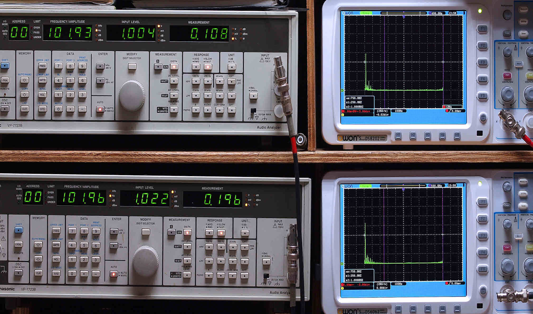 | T. 修理前点検測定。 画像をクリックすると、大きく(横幅2050ドット)表示されます。 T1. 出力、歪み調整・測定、電源電圧は100Vにて測定 「見方」。 上段中 右側出力を「Audio Analyzer Panasonic VP−7723B」により測定。 表示LED、 左端=メモリーNo、 中左=周波数測定、 中右=出力電圧測定、 右端=歪み率測定。 上段右端 VP−7723Bの基本波除去出力を「owon SDS8202(200MHZ)」で「FFT分析」表示。 VP−7723Bで増幅された物を分析していますので、レベルは相対的比較です。 よって、測定条件が変わる場合は比較検討は無意味です 下段中 左側出力を「Audio Analyzer Panasonic VP−7723B」により測定。 表示LED、 左端=メモリーNo、 中左=周波数測定、 中右=出力電圧測定、 右端=歪み率測定。 下段右端 VP−7723Bの基本波除去出力を「owon SDS6062(200MHZ)」で「FFT分析」表示。 下段左端 オーディオ発振器 VP−7201A より100Hz〜10kHzの信号を出し(歪み率=約0.003%)、ATT+分配器を通し、AMPに入力。 よって、ダイアル設定出力レベルより低くなります。測定機器の仕様や整備の様子はこちら、「VP−7723B」「VP−7201A」 下の100kHz入力は帯域外なので、歪みが多い。 FFT画面の見方はこちら。 |