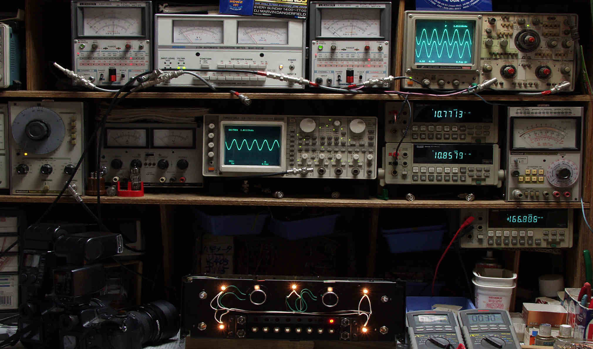 下段左端 オーディオ発振器より400HZ・1KHZの信号を出し(歪み率=約0.003%)これをAMPに入力し、出力を測定