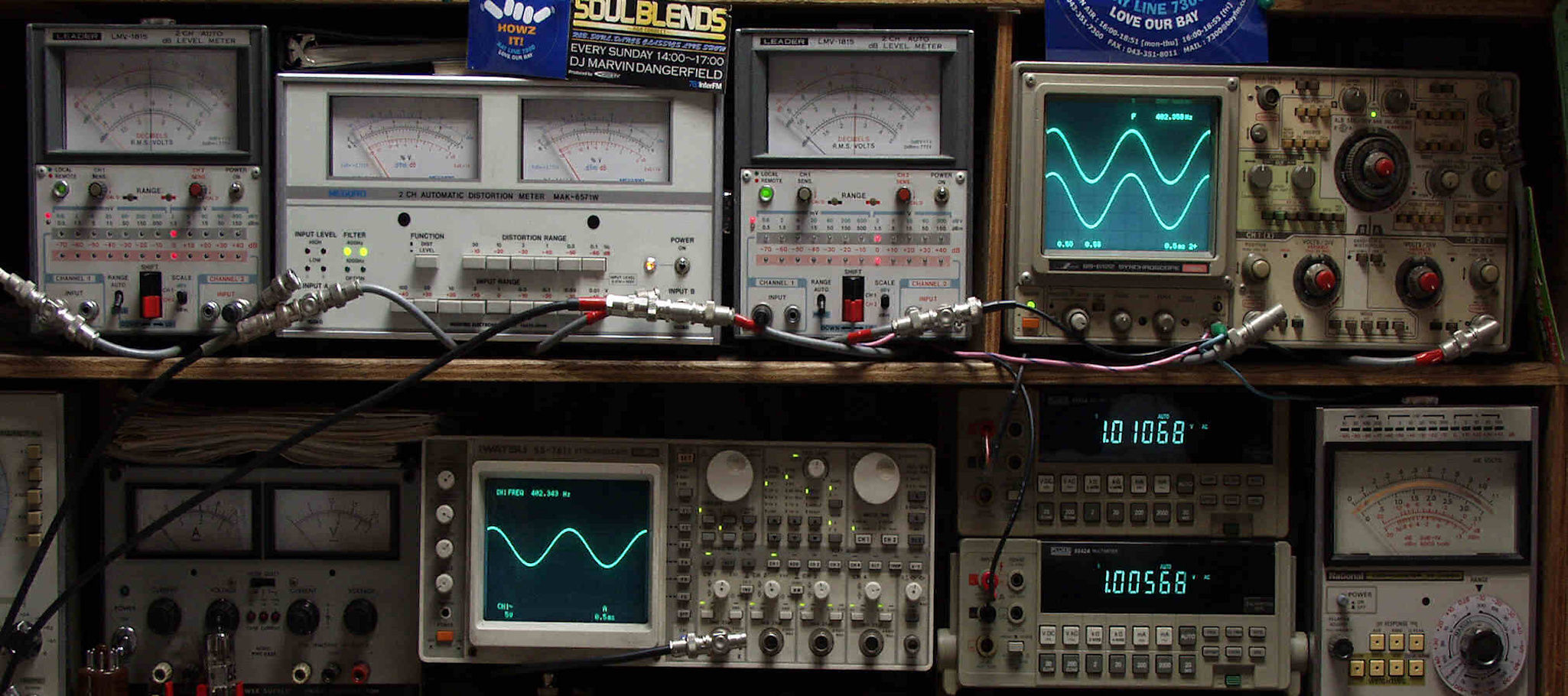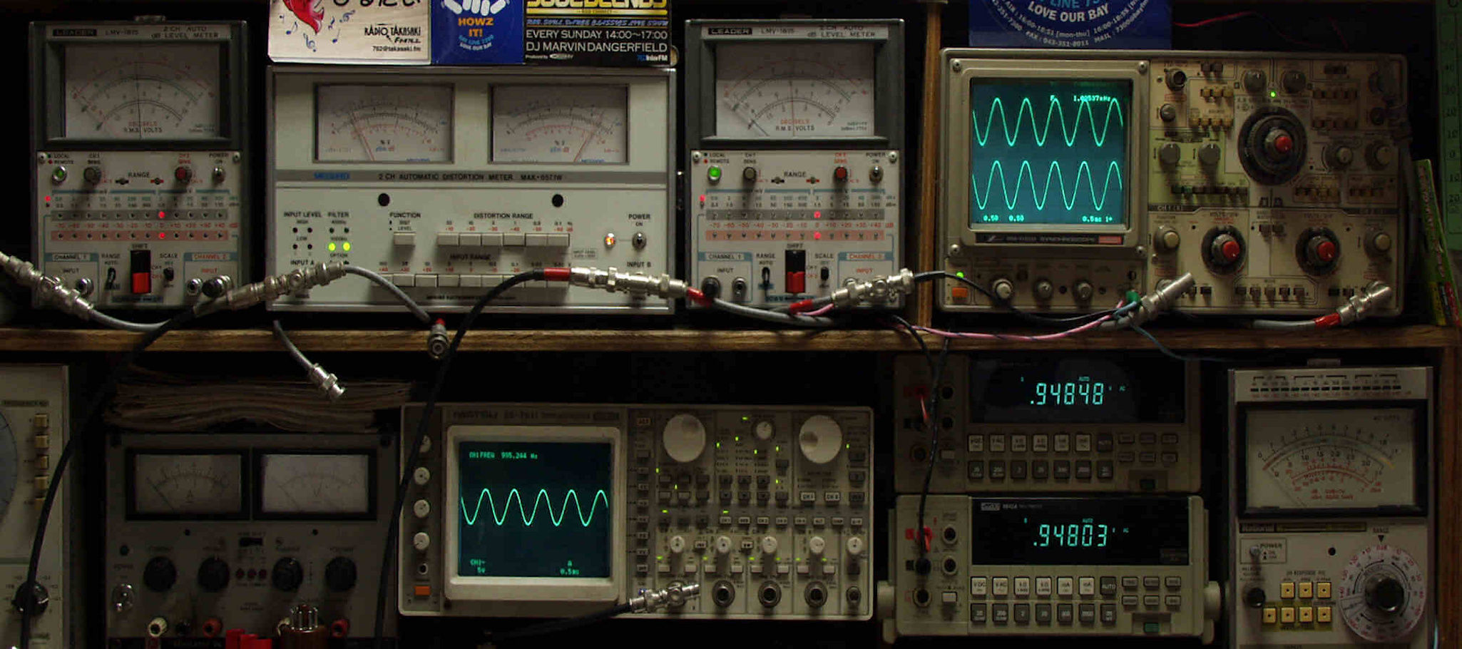 上段中左 歪み率計=出力の歪み率測定 左メータ=L出力、右メータ=R出力