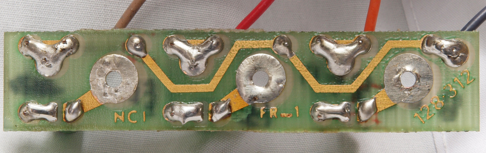 | C64. 修理修理(半田補正)後 TREBLコントロール基板裏。 半田を全部やり直す。 | ||||||||||||||||||||||||||||||||||||||||||||||||||