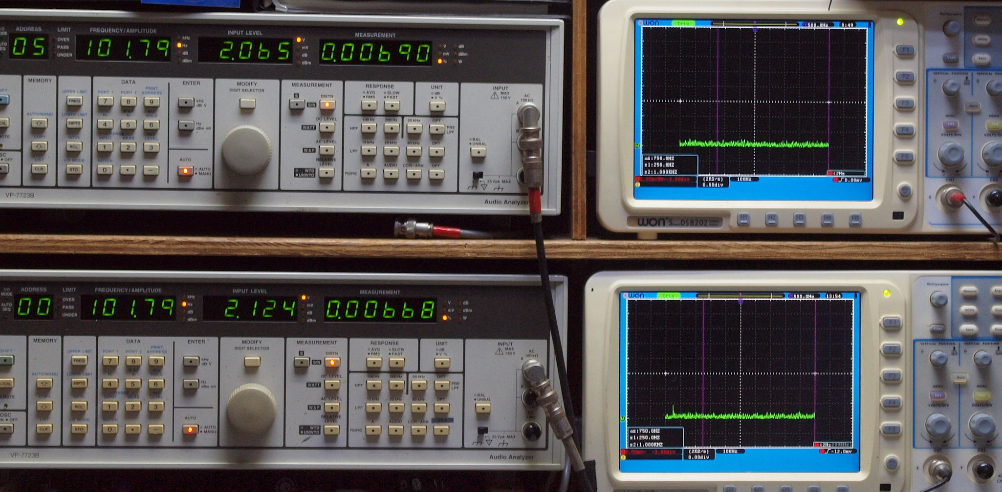 | E. 調整・測定。 画像をクリックすると、大きく(横幅2050ドット)表示されます。 E0. 出力・歪み率測定・調整、「電源電圧は50HZ 100V」。 「見方」。 上段中 右側出力を「Audio Analyzer Panasonic VP−7723B」により測定。 表示LED、 左端=メモリーNo、 中左=周波数測定、 中右=出力電圧測定、 右端=歪み率測定。 上段右端 VP−7723Bの基本波除去出力を「owon SDS8202(200MHZ)」で「FFT分析」表示。 下段中 左側出力を「Audio Analyzer Panasonic VP−7723B」により測定。 表示LED、 左端=メモリーNo、 中左=周波数測定、 中右=出力電圧測定、 右端=歪み率測定。 下段右端 VP−7723Bの基本波除去出力を「owon SDS6062(200MHZ)」で「FFT分析」表示。 下段左端 オーディオ発振器 VP−7201A より50Hz〜100kHzの信号を出し(歪み率=約0.003%)、ATT+分配器を通し、AMPに入力。 よって、ダイアル設定出力レベルより低くなります。測定機器の仕様や整備の様子はこちら、「VP−7723B」「VP−7201A」。 FFT画面の見方はこちら。 |