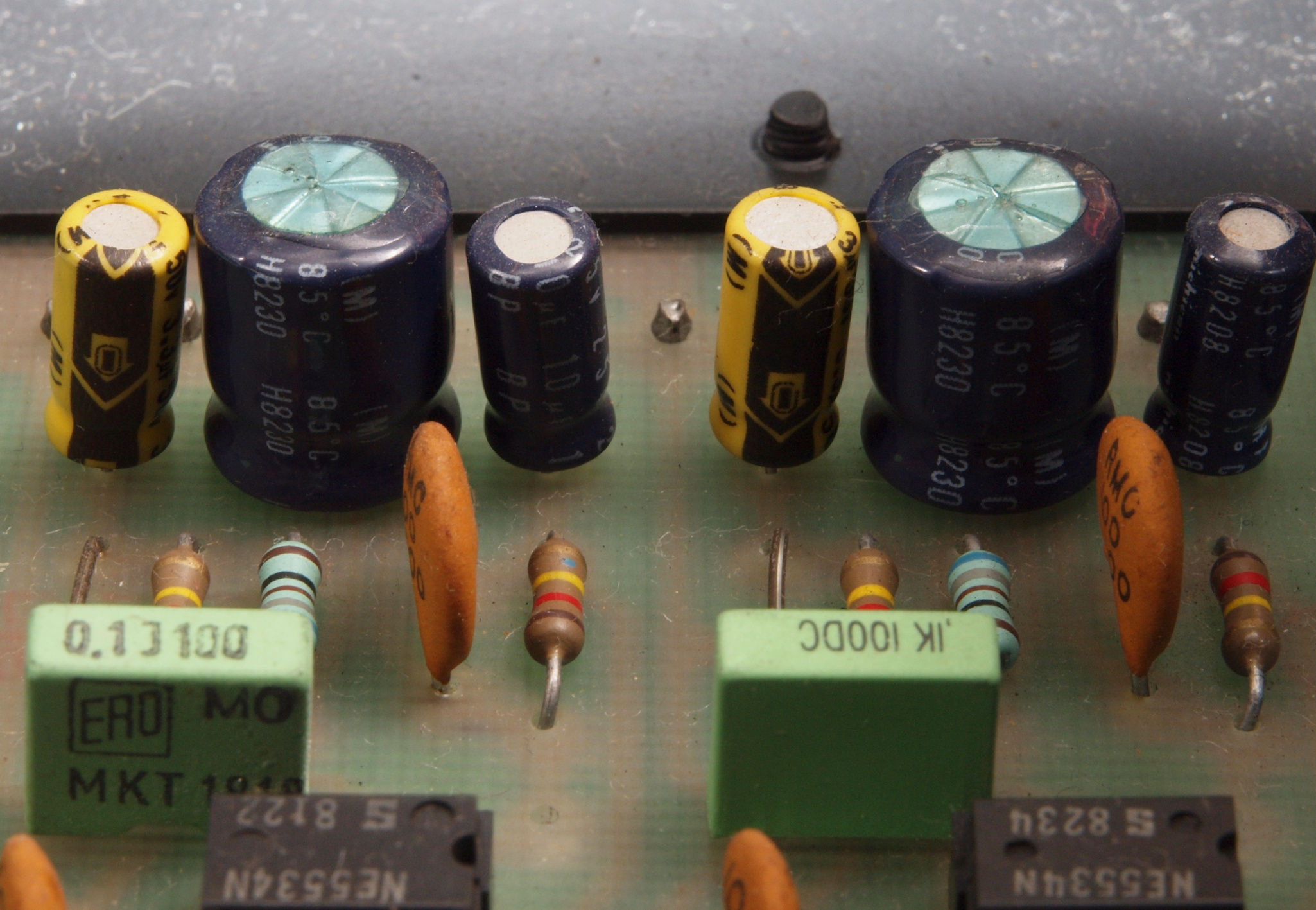 | A25. 点検中 イコライザーAMPの電解コンデンサー、頭が大分膨れている。 | ||||||||||||||||||||||||||||||||||||||||||||||||||